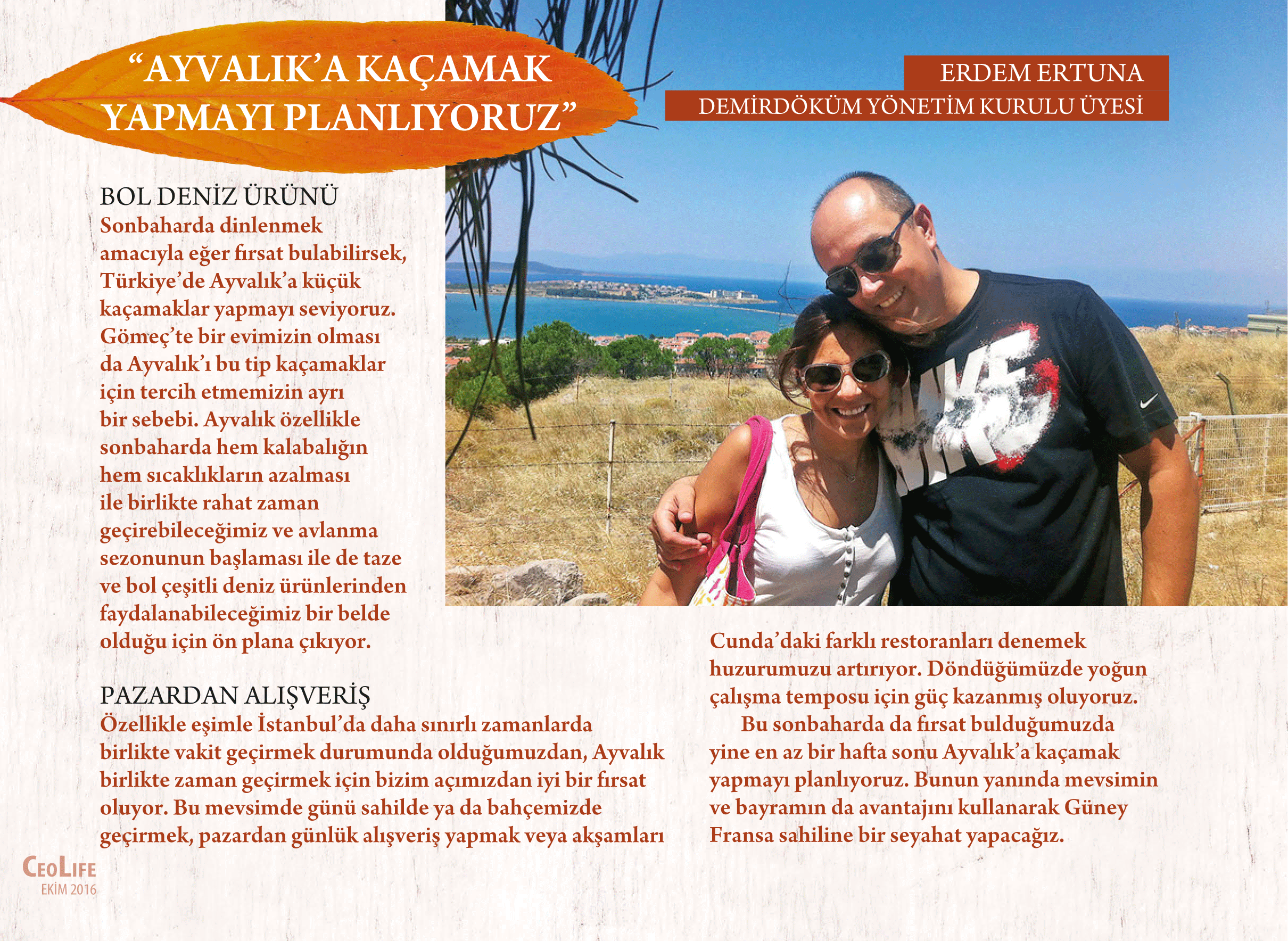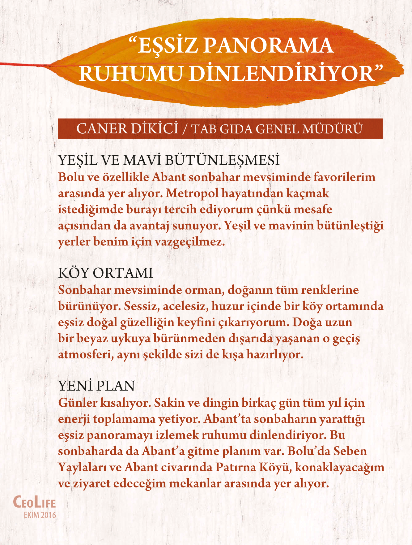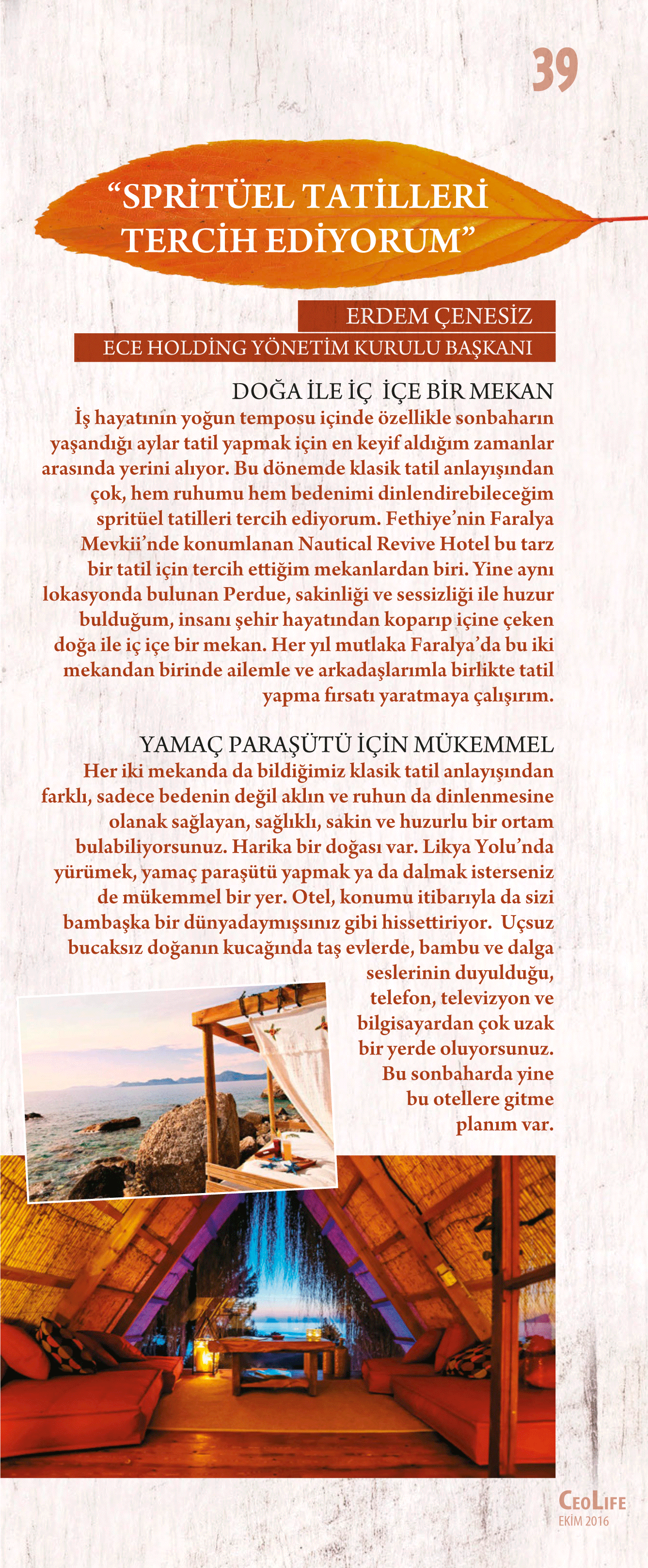CEOLife iş dünyasının sonbahar tatil planlarını ve bu mevsimde tercih ettikleri en özel yerleri ortaya çıkardı. Böylelikle bir anlamda hem Türkiye’nin dört bir yanında hem yurt dışında sonbaharı en anlamlı ve keyifli kılacak yerlerin de listesini çıkarmış oldu.