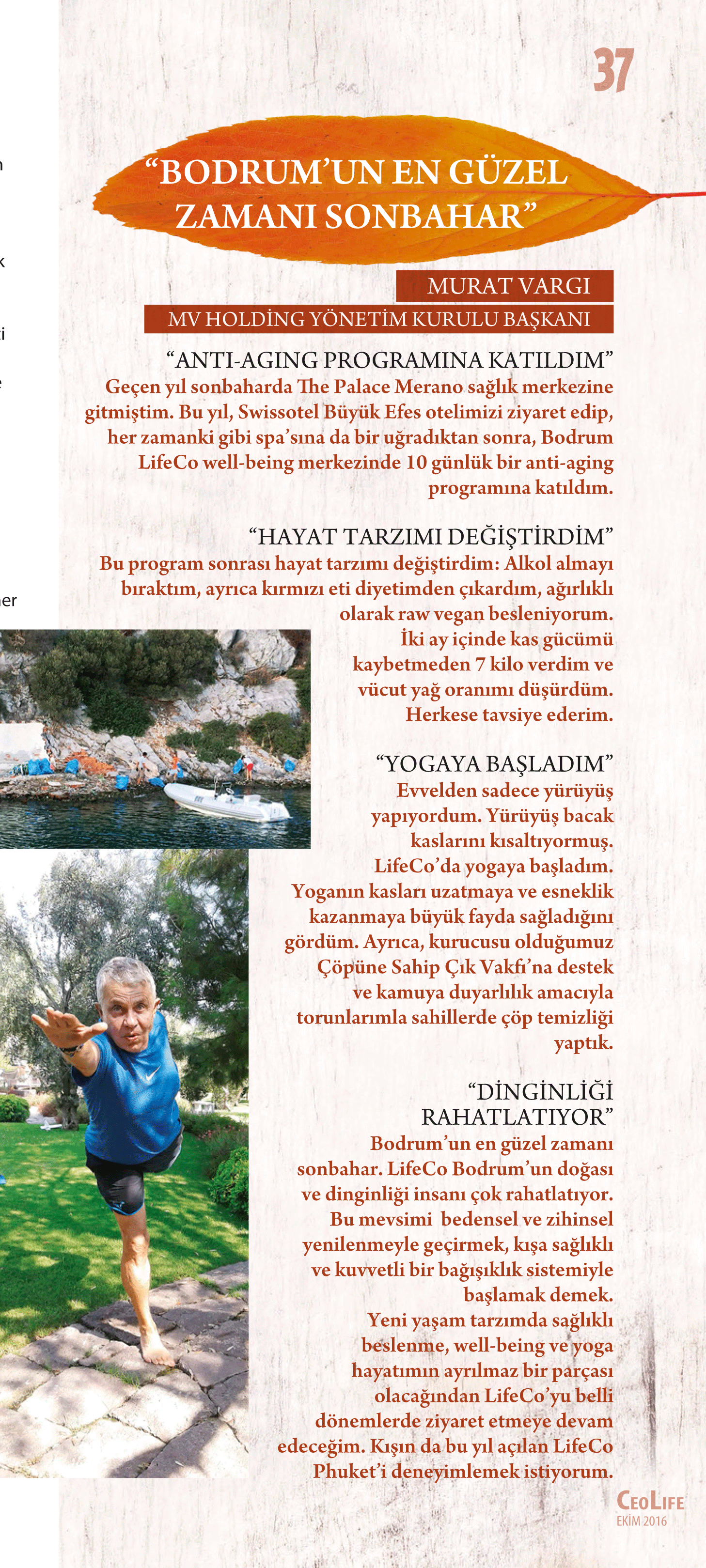 Sarkuysan Yönetim Kurulu Başkanı Hayrettin Çaycı’nın favori kaçış noktası Bodrum ve Datça. Çaycı, “Sonbaharda da bu mekanları güzelleştiren ve özel kılan özellikleri, yazın soğuk olan deniz suyunun ısınmış olması, denizin içinde daha uzun süre kalma imkanı vermesi, doyumsuz yüzme zevki, sakin durgun bir deniz olarak sıralamak mümkün” diyor. Perform Türkiye ve Doğu Avrupa Genel Müdürü Emre Uğurlu için sonbaharda yurt içinde ve yurt dışında gidilmesi gereken sadece birer adres var. Yurt dışında Londra, Türkiye’de ise Hillside Beach Club. Hillside Beach Club’a yazın sıcak dönemlerinden daha çok eylül/ekim aylarında gitmeyi tercih ettiğini belirten Uğurlu, “Bir yandan doğanın tadını çıkarırken, bir yandan da mekanın muhteşem SPA’sında kendime vakit ayırıyorum” diye konuşuyor. Permolit Boya CEO’su Akın Akçalı için de sadece sonbaharda değil yılın her dönemi en güzel yer Bodrum. Bodrum’un en güzel mevsiminin de sonbahar olduğunu düşünen Akçalı, özellikle eylül ayının 15’inden kasım ayının 15’ine kadar olan dönemin Bodrum için ideal olduğunu düşünüyor. Bodrum’u bu kadar çok sevme nedenlerini ise şöyle açıklıyor: “Bodrum, yelken sporunu sevenler için bulunmaz bir güzellik.” Ancak bu sonbahar Akçalı’nın Bodrum’un yanı sıra başka bir rotası daha var. O da Karadağ. Birkaç aile toplanarak Kotor’da tatil yapacaklarını söylüyor.