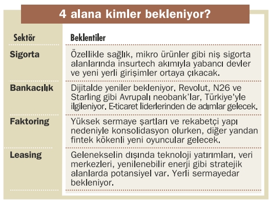 Bu dalga, finansın diğer alanlarına da yansıyor. Sigortacılık ve leasingde de önümüzdeki 2 yıl içinde yeni şirketlerin geleceğine kesin gözüyle bakılıyor.