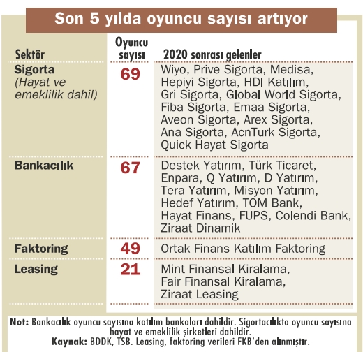 Finansın her alanında son beş yıldır oyuncu sayısı artıyor. Önümüzdeki iki yılda da yatırımcıların iştahının devam edeceğine kesin gözüyle bakılıyor. Sigorta ve leasing sektörlerinde niş alanlara göz dikilirken ağırlaşan regülasyonlara uyum temel kriter olacak. Bankacılıktaysa yıldızı parlayan yine dijital bankacılık olacak.