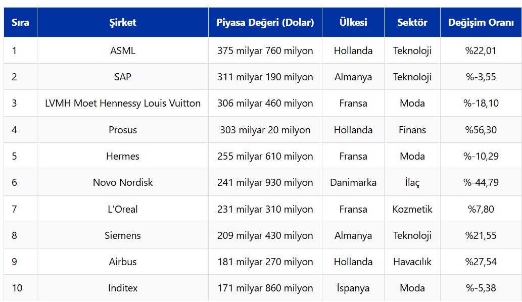 Avrupa'nın en değerli 10 şirketinin piyasa değerleri, sektörleri ve hisse fiyatlarının yılbaşından bu yana yüzdesel farkları şöyle: