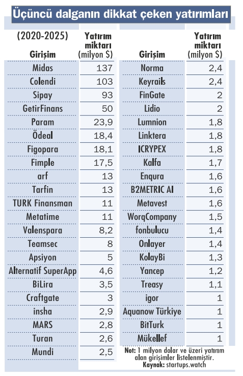 Üç dalgada şekillenen Türkiye fintek yolculuğu; 2000’lerde kıpırdanma, 2010’larda regülasyon destekli ivmelenme, 2020’lerde yatırım patlamasıyla olgunluk evresine geçti. Bugün sektörde 982 şirkete ulaşıldı. Yatırımlar 2025’te 201,3 milyon dolarla rekor kırdı. Midas’ın 80, Sipay’in 78, Fimple’ın 12 milyon dolarlık turları ölçeklenmenin mümkün olduğunu gösterdi. Sıradaki dalganın açık bankacılık, gömülü finans ve yapay zekanın rehberliğinde finansal davranışları yeniden tasarlaması bekleniyor.