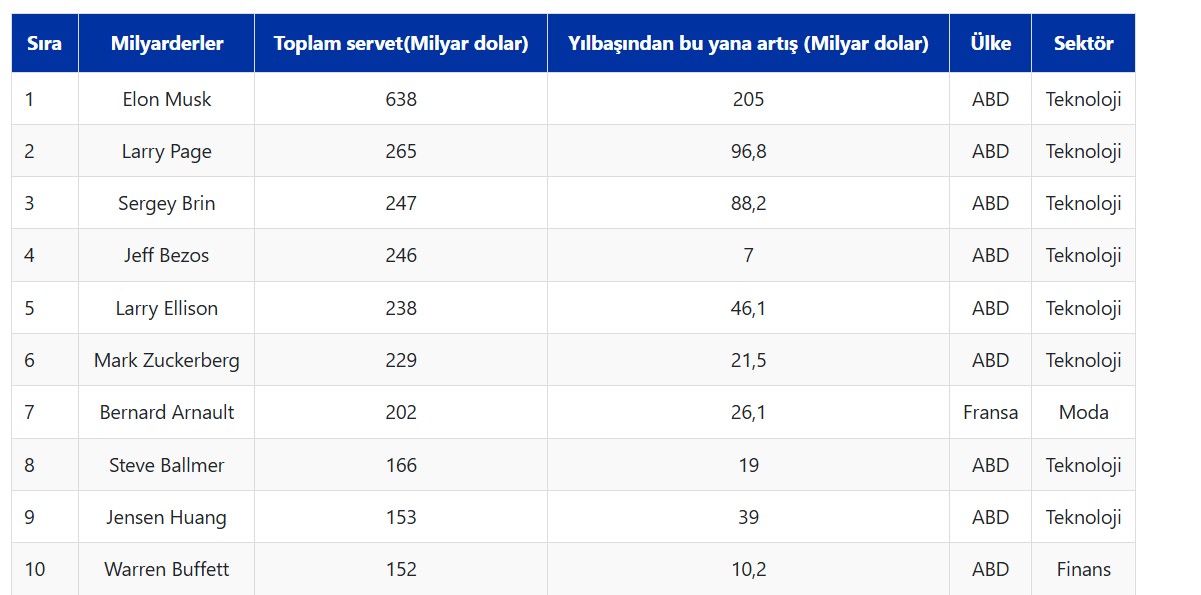 Zirvedeki isim Elon Musk, yılın başından bu yana servetini 205 milyar dolar artırarak 638 milyar dolara çıkardı ve "dünyanın en zengin kişisi" ünvanını korudu. Musk, bu artışla aynı zamanda listede servetini en fazla büyüten isim olarak kayıtlara geçti.