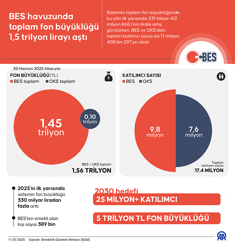 Böylelikle, BES ve OKS'deki devlet katkısı ile katılımcı fon tutarlarının toplam büyüklüğü yılın ilk yarısı itibarıyla 1 trilyon 558 milyar 642,2 milyon liraya ulaşırken, toplam katılımcı sayısı 17 milyon 408 bin 297'ye ulaştı.