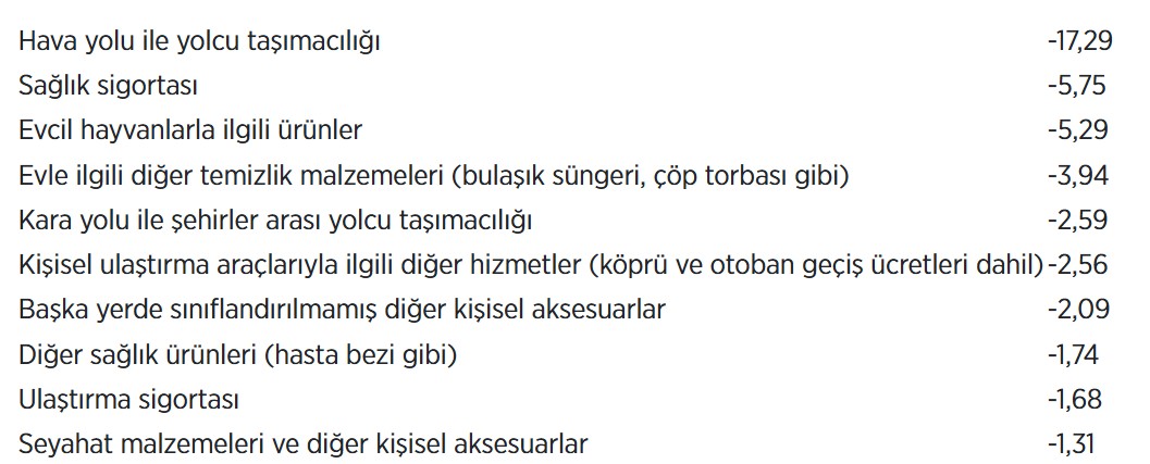 Geçen ay en fazla fiyat düşüşü, yüzde 17,29 ile hava yoluyla yolcu taşımacılığında gerçekleşti. Bunu yüzde 5,75 ile sağlık sigortası, yüzde 5,29 ile evcil hayvanlarla ilgili ürünler, yüzde 3,94 ile evle ilgili diğer temizlik malzemeleri (bulaşık süngeri, çöp torbası gibi), yüzde 2,59 ile kara yoluyla şehirler arası yolcu taşımacılığı takip etti.