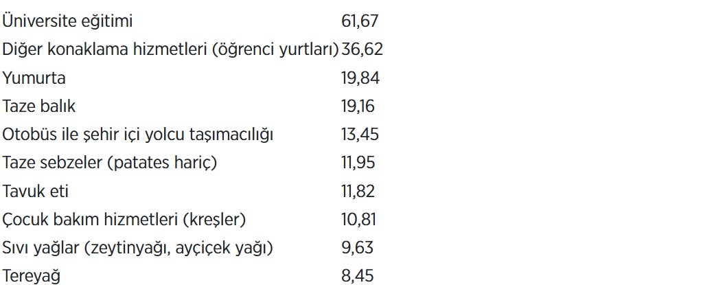 Türkiye İstatistik Kurumu (TÜİK) verilerine göre, üniversite eğitimindeki fiyat artışını, yüzde 36,62 ile diğer konaklama hizmetleri (öğrenci yurtları) ve yüzde 19,84 ile yumurta izledi.