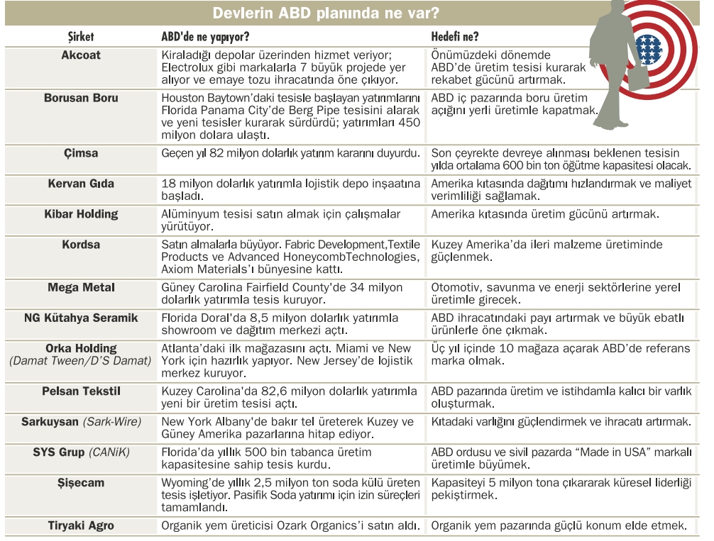 Türk şirketleri ABD pazarında artık yalnızca ürün satmıyor, üretim ve dağıtım için kalıcı yatırımlar yapıyor. Örneğin Kordsa, ABD pazarında satın almalarla büyüyor. 2018 yılında uzay ve havacılık sektörüne ileri kompozit malzemeler sağlayan Fabric Development, Textile Products ve Advanced Honeycomb Technologies’i yaklaşık 100 milyon dolara satın aldı. Ardından 2019’da bu kez uzay ve havacılık endüstrisinin yanı sıra gelecek nesil ulaşım araçlarına ileri teknoloji kompozit malzemeler sağlayan Axiom Materials’ın yaklaşık yüzde 96’sını, 181 milyon dolar şirket değeri üzerinden, bünyesine kattı. Çimentoda da Sabancı Grubu’nun ABD’de önemli yatırımları bulunuyor. Houston’daki öğütme tesisiyle ABD’de üretim yapan Çimsa, 600 bin ton yıllık kapasiteye sahip tesise yönelik geçen yıl 82 milyon dolarlık yatırım kararı aldı.
