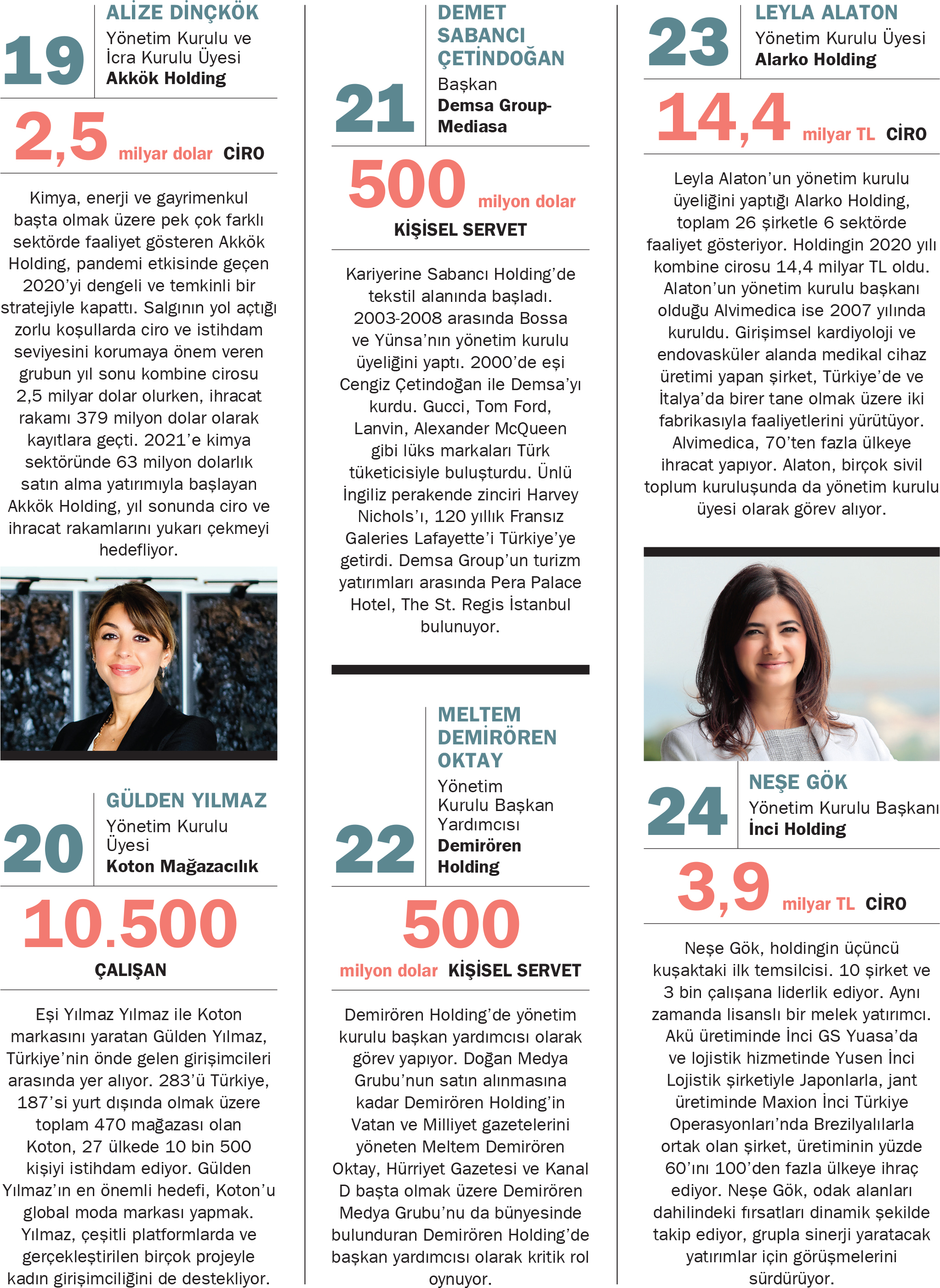 Capital tam 21 yıldır “Türkiye’nin En Güçlü 30 İş Kadını Araştırması”nı gerçekleştiriyor. Kadınların iş dünyasındaki gücüne vurgu yapan bu çalışmayla milyarlarca dolarlık yatırımlarla ekonomiye ve istihdama yön veren, sadece işteki performanslarıyla değil sivil toplum örgütlerindeki etkin rolleri ve yürüttükleri sosyal sorumluluk çalışmalarıyla da toplumu etkilemeyi başaran isimleri bir araya getiriyor. Bu yıl da birbirinden değerli isimleri buluşturan araştırma, 30 güçlü kadını ve onları güçlü kılan özelliklerini ortaya koyuyor.