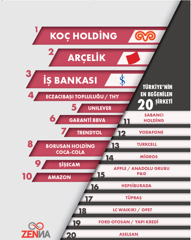 Bu yıl da ZENNA Araştırma’nın katkılarıyla hazırlanan listede, Koç Holding, “En Beğenilenler” listesinde zirveyi bırakmadı. Arçelik ikincilik, İş Bankası üçüncülük, Eczacıbaşı Topluluğu dördüncülük koltuğunu korudu. THY bir basamak çıkarak dördüncülüğe, Unilever 4 basamak çıkarak beşinciliğe yerleşti. Listede tam 20 şirket yer değiştirdi.