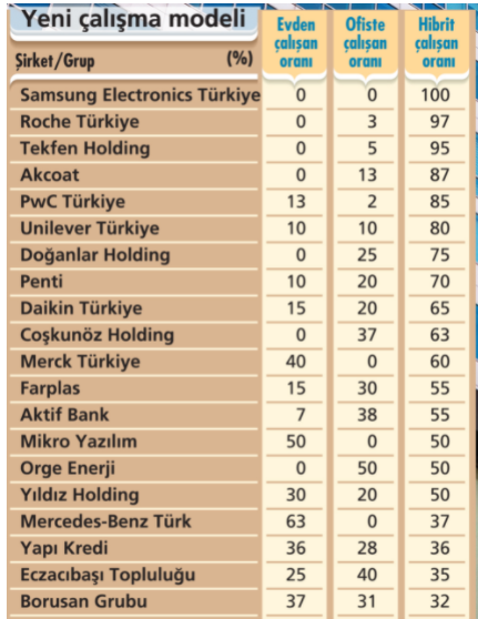 Burgan Bank, yüzde 75 ile çoğunlukla evden çalışanlardan... Bankada “idari işler, güvenlik, bilgi teknolojilerindeki yardım masası” gibi bazı kritik birimler çoğunlukla ofiste. Şirket, normal hayata geçişin ardından yüzde 50 ev/ofis dengesiyle hibrit modele geçme kararı aldı. Burgan Bank İK, Organizasyon ve Kurumsal İletişim Genel Müdür Yardımcısı Levent Ergin, “Çalışanlarımız dönüşümlü olarak istedikleri yerden işlerine devam edebilecek” diyor. İş tanımına bağlı olarak yüzde 88 oranında evden çalışmaya devam eden Doğuş Holding, pandemi sonrası tamamıyla hibrite geçme kararında. Doğuş Holding İK Bölüm Başkanı Busen Kasapoğlu Özen, “Ofislerimizde çalışanların ortak projeler geliştirmek için bir araya gelebilecekleri yeni sinerji alanları tasarlıyoruz” diye konuşuyor. Yine Hero Baby Türkiye de pazarlama, İK, finans ve satın alma gibi destek fonksiyonlarıyla yüzde 79 oranında evden çalışıyor. Şirketin İK müdürü Merve Demiral, “Özellikle çalışan annelerimiz hibrit model çalışmayı daha fazla tercih ediyor” diyor.