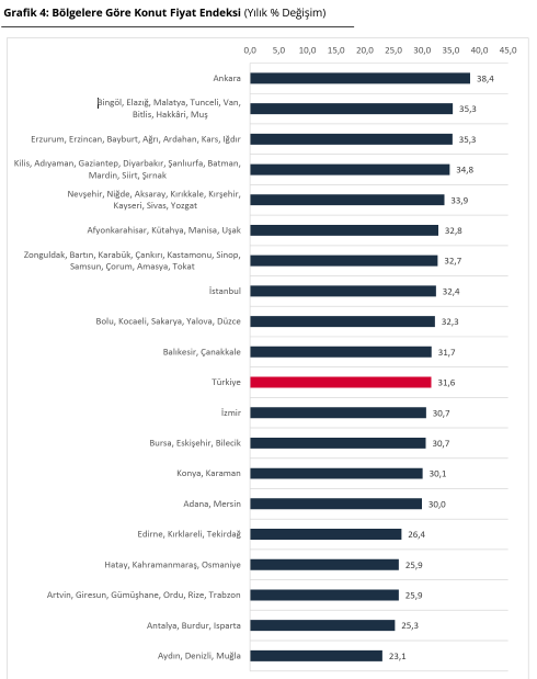 İstatistiki Bölge Birimleri Sınıflamasına göre bölgelerin yıllık konut fiyat endeksi değişimleri incelendiğinde, Ekim 2025 döneminde en yüksek yıllık artış yüzde 38,4 ile Ankara bölgesinde, en düşük yıllık artış ise yüzde 23,1 ile Aydın, Denizli, Muğla bölgesinde gözlendi.