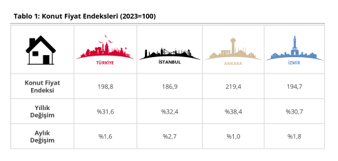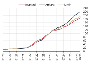 Ekim ayında İstanbul, Ankara ve İzmir’de bir önceki aya göre, sırasıyla yüzde 2,7, 1,0 ve 1,8 oranlarında artış gözlendi. Endeks değerleri bir önceki yılın aynı ayına göre, İstanbul, Ankara ve İzmir’de sırasıyla yüzde 32,4, 38,4 ve 30,7 oranlarında artış gösterdi.