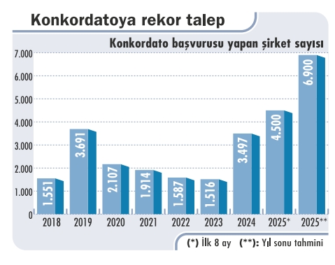 Bu yıl konkordato başvurularında rekor artış olduğunu söyleyen Pusula Danışmanlık Kurucusu, Mali Müşavir ve Hile Denetim Uzmanı Fikriye Aslan, geçen yıl toplam 3 bin 497 şirket konkordato talebinde bulunurken bu yılın ilk 8 ayında bu sayının yaklaşık 4 bin 500 şirkete yükseldiğini belirtiyor. Yıl sonunda konkordato talebinde bulunan şirket sayısının geçen yılkine göre iki katına yakın artarak 7 bine yaklaşacağını tahmin eden Aslan, “Öncelikle tekstil, hazır giyim, inşaat, mobilya ve turizmde konkordato talebinde ve iflaslarda büyük artış var” diyor. Bu yıl köklü ve bilinen şirketlerin de konkordato talebini duyduklarını anlatan Aslan, son beş senedir artarak devam eden ekonomik krizin artık büyük grup şirketlerinin sermaye ve finansman yapısını da bozduğunu ve devam edilemez bir sürece ittiğini ifade ediyor.