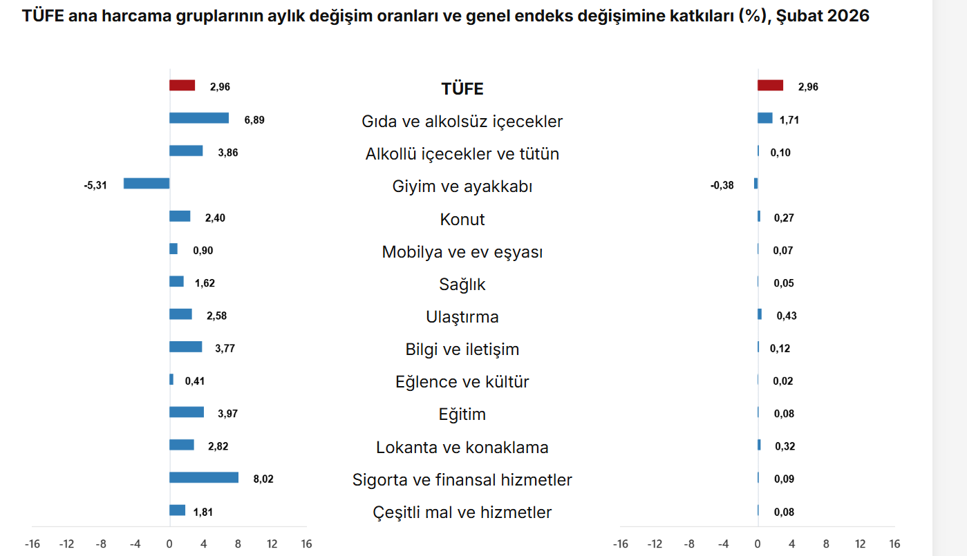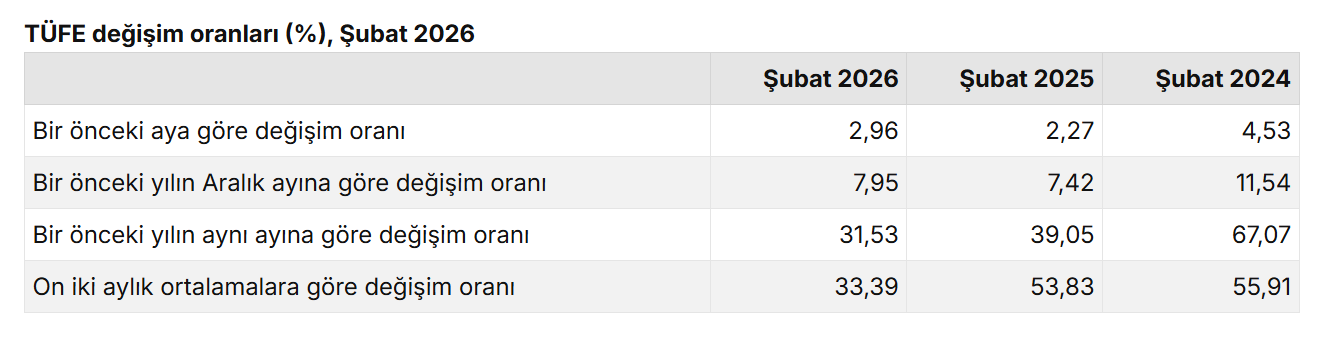 TÜFE'deki (2025=100) değişim 2026 yılı Şubat ayında bir önceki aya göre %2,96 artış, bir önceki yılın Aralık ayına göre %7,95 artış, bir önceki yılın aynı ayına göre %31,53 artış ve on iki aylık ortalamalara göre %33,39 artış olarak gerçekleşti.