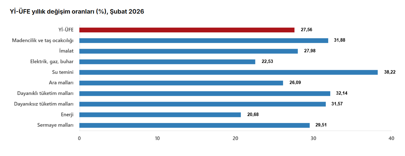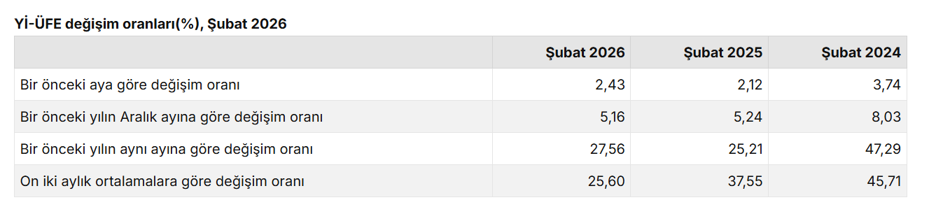 Yİ-ÜFE (2003=100) 2026 yılı Şubat ayında bir önceki aya göre %2,43 artış, bir önceki yılın Aralık ayına göre %5,16 artış, bir önceki yılın aynı ayına göre %27,56 artış ve on iki aylık ortalamalara göre %25,60 artış gösterdi.