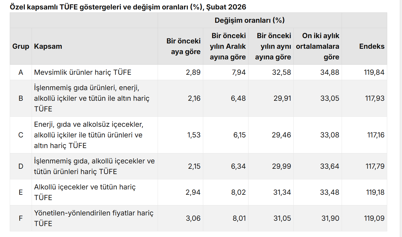İşlenmemiş gıda ürünleri, enerji, alkollü içkiler ve tütün ile altın hariç TÜFE'deki değişim, 2026 yılı Şubat ayında bir önceki aya göre %2,16 artış, bir önceki yılın Aralık ayına göre %6,48 artış, bir önceki yılın aynı ayına göre %29,91 artış ve on iki aylık ortalamalara göre %33,05 artış olarak gerçekleşti.