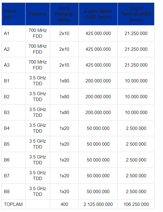 700 MHz ve 3,5 GHz bantlarında toplam 400 MHz'lik frekans kaynağının asgari değer toplamı KDV hariç yaklaşık 2 milyar 125 milyon dolar olacak.