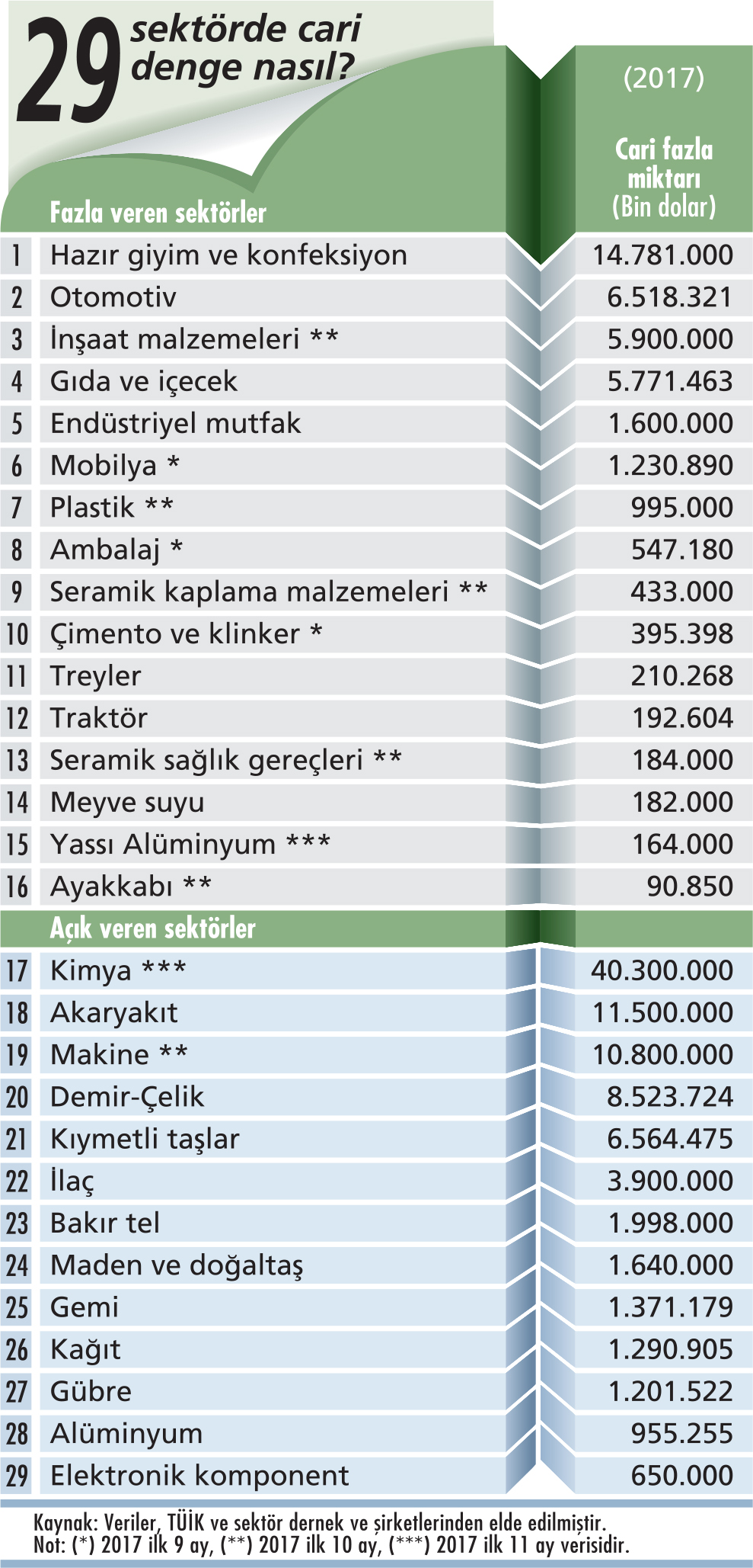 Tıpkı ülkeler gibi sektörlerin de cari dengesi var. Bazı sektörler cari fazla verirken bazıları açık veriyor. Dolayısıyla ülke ekonomisinin cari karnesinde büyük bir rol oynuyorlar. Son 10 yıldır büyümesi cari açıkla gölgelenen Türkiye ekonomisinin en fazla cari açık yaratan sektörlerinin başında ise enerji, kimya, makine, demir çelik, mücevher, ilaç, bakır,maden geliyor. Örneğin geçtiğimiz yılın ilk 11 aylık verilerine göre kimya sektörü 40,3 milyar dolar, ilk 10 aylık verilere göre makine sektörü 10,8 milyar dolar, demir çelik sektörü yılın tamamında 8,5 milyar dolar cari açık verdi. Öte yandan Türkiye’de cari fazla veren birçok sektör de var. Hazır giyim, konfeksiyon, otomotiv, inşaat malzemeleri ve mobilya bu sektörler arasında öne çıkıyor. 2017’de hazır giyim ve konfeksiyon 14 milyar 781 milyon dolarlık cari fazla verdi. Otomotiv 6,5 milyar dolar, inşaat malzemeleri de 5,9 milyar dolarlık cari fazlayla dikkat çeken sektörler oldu. Peki neden bazı sektörler cari açık verirken bazıları fazla veriyor? Her sektörün bu soruya farklı bir yanıtı var. Cari açıkta temel neden, ülkemizde üretilmeyen ürünlerde dışa bağımlılık olarak öne çıkıyor. Cari fazla veren sektörler ise iç ve dış pazarlarda sahip oldukları dev üretim kapasiteleri ve rekabetçi pozisyonlarıyla dikkat çekiyorlar. Capital 29 sektörün cari karnesini belirledi, bir anlamda Türkiye ekonomisinin üretim ve rekabet gücündeki güçlü ve zayıf yönlerini ortaya çıkarmış oldu.