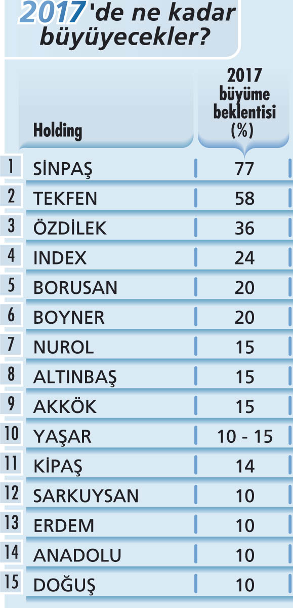 Bu yıl holdingler cephesinden en güzel haber ise yatırım konusunda adeta vites büyütmüş olmaları. Tosyalı Grubu, 2017 içinde 2 milyar 200 bin doları aşan bir yatırımı tamamlamak niyetinde. Tosyalı Holding Yönetim Kurulu Başkanı Fuat Tosyalı, yeni yatırımlara da başlayacaklarını belirtiyor. Anadolu Grubu 500 milyon dolarlık, Doğan Holding 500 milyon TL’lik, Akfen Holding, 6,6 milyar TL’lik, Akkök, 1,2 milyar TL’lik yatırım bütçesine sahip. Erdem Holding ise gelecek 3 yılda 500 milyon TL’lik yatırımı hayata geçirmeyi planlıyor. Kipaş’ın yatırım ajandası da yoğun. Aydın’da faaliyet gösterecek yeni bir kağıt fabrikasının yatırımına başladıklarını açıklayan Kipaş Holding Yönetim Kurulu Başkanı Hanefi Öksüz, “Toplamda 500 milyon dolarlık bir yatırım yapacağız. Bu yıl 130 milyon doları harcayacağız. Ayrıca Aydın’da yeni bir gaz beton tesisi ve Eskişehir’de ambalaj fabrikası kuruyoruz” diyor. Altınbaş Holding’in farklı sektörler için toplam 300 milyon doları aşkın yatırım planı var. Mücevheratta 50 mağaza ile 100 milyon dolarlık yatırım yapacaklarını açıklayan holdingin başkanı Vakkas Altınbaş, “Ayrıca 100 milyon dolar ile hastane yatırımı yapacağız. Alpet ile akaryakıt istasyonlarını geliştireceğiz” diyor. Kale Grubu Başkanı Zeynep Bodur Okyay, Kale Grubu olarak 2017’de yaklaşık 170 milyon TL’lik yatırım yapmayı planlıyoruz. Bunun büyük bölümünü de savunma ve havacılık sektörü için öngörüyoruz” diye konuşuyor.