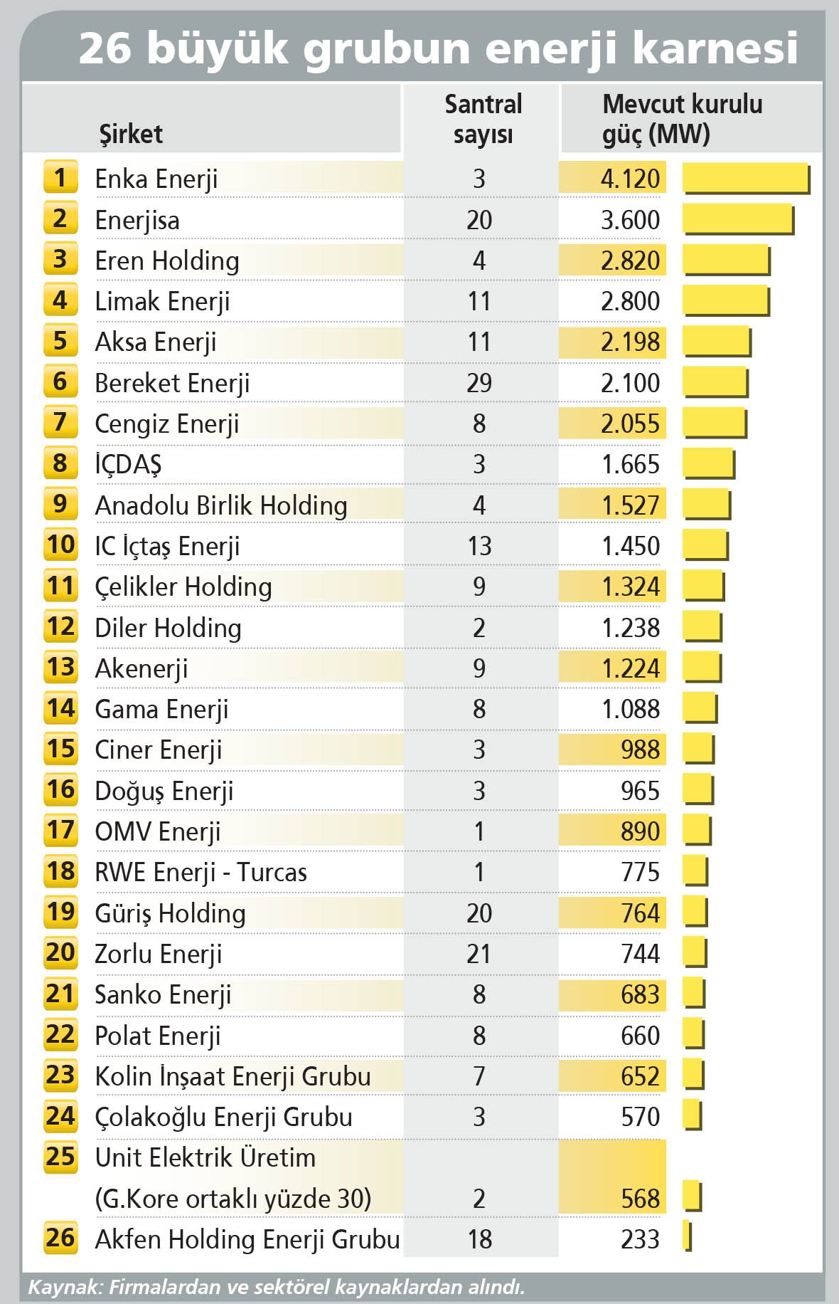 Peki son 2-3 yıla damgasını vuran gelişmeler, rekabeti nasıl etkiliyor? Açıkçası yatırımlardaki durağanlık, 2 yıl öncesinin “enerji devleri” listesiyle kıyaslandığında da görülüyor. Cirosunun yüzde 40’ını enerji üretiminden sağlayan Enka Holding, 2015’te 3 bin 854 MW’lik kurulu güçle ilk sıradaydı. Bugünkü kurulu gücü 4 bin 120 MW. 2 yıl öncesine göre Aksa Enerji, Doğuş, Limak’ın kurulu gücünde bir farklılık yok. Kurulu güç ve yatırımlar açısından son 2 yılda atağa geçenler ise Enerjisa, Eren Holding ve Sanko. Enerjisa’nın, yaptığı yatırımlarla kurulu gücünü 2 bin 560’dan 3 bin 600 MW’ye çıkardığı görülüyor. Eren Holding’in kurulu gücü ise 1.390 MW’den 2 bin 820 MW’ye yükseldi. Sanko Holding de son iki yılda 575 MW olan kurulu gücünü 8 santrale ve 683 MW’ye çıkarmayı başardı. Uzmanlar, bu sıralamanın, birkaç yıl içinde beklenen konsolidasyon rüzgarıyla değişeceğini belirtiyor. Dolayısıyla pazardaki güç dengesi de tamamen farklılaşabilir. Peki son günlerde pazara giren yeniler var mı? Aslında evet. Özellikle teşviklerle birlikte ihalelere giren ve adını yeni duyuran yerliler dikkat çekiyor. Sektörde yeni adını duyuran gruplar olarak İklim Elektrik Yatırım, MKS Marmara, İlk İnşaat, Beyçelik Gestamp şirketleri dikkat çekiyor. Akfen Holding Yenilenebilir Enerji Genel Müdür Yardımcısı Kürşat Tezkan da YEKA ihalesiyle yeni oyuncuların pazara giriş yaptığını belirtiyor: “Rüzgar ve güneş enerjisi kaynaklı üretim kapasitesi için uygulanan YEKA modelinin başarılı olması ve çok sayıda grubun süreçlere katılması olumlu ve dikkat çekici bir gelişme.”