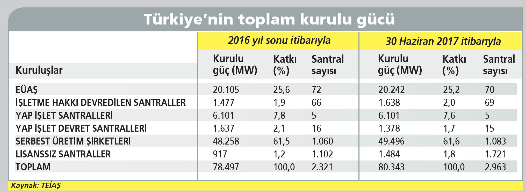 Gerek talep, gerekse yatırım açısından pazarın yükselen yıldızı yenilenebilir enerji. Uzmanlara göre inşa halindeki santraller de dahil edildiğinde Türkiye hidrolik enerjide 36 GW ile doygunluk evresine girebilir. Güneş ve rüzgar enerjilerinin geleceği ise hala çok parlak. Zaten yatırımcı iştahının sebebi de bu. Güneş enerjisinde bugün 1,4 GW’lik kurulu güce ulaşıldı. Rüzgar enerjisi kurulu gücü 2017 Haziran itibarıyla 6,1 GW’ye yükseldi. Sektör devlerinin ilgi alanı da yenilenebilir enerjiden yana… Hatta sadece bu alana odaklanan çok sayıda grup var. Akfen gibi... “Piyasanın ilgi odağı olan yenilenebilir enerji yatırımlarında aktif olarak varız” diyen Akfen Holding Yenilenebilir Enerji Genel Müdür Yardımcısı Kürşat Tezkan, stratejilerini şöyle anlatıyor: “Proje aşamasındaki santraller işletmeye alındığında kurulu gücümüz 572 MW olacak. Orta vadede yaklaşık 1.000 MW kurulu güce ulaşmayı hedefliyoruz.” 683 MW kurulu gücü olan Sanko Holding’de toplam üretimin yüzde 84’ü HES, yüzde 16’sı ise RES ile sağlanıyor. Kolin ise sadece hidrolik santrallere yatırım yapıyor. Kolin Strateji ve Planlama Direktörü Arzu Hatice Atik, planlarını şöyle özetliyor: “Elektrik üretimde toplam kurulu güç hedefimiz 5 bin MW. Tamamı yerli ve yenilenebilir kaynaklara dayalı, ülkemiz için stratejik öneme sahip olan santrallere yatırım yapacağız.”