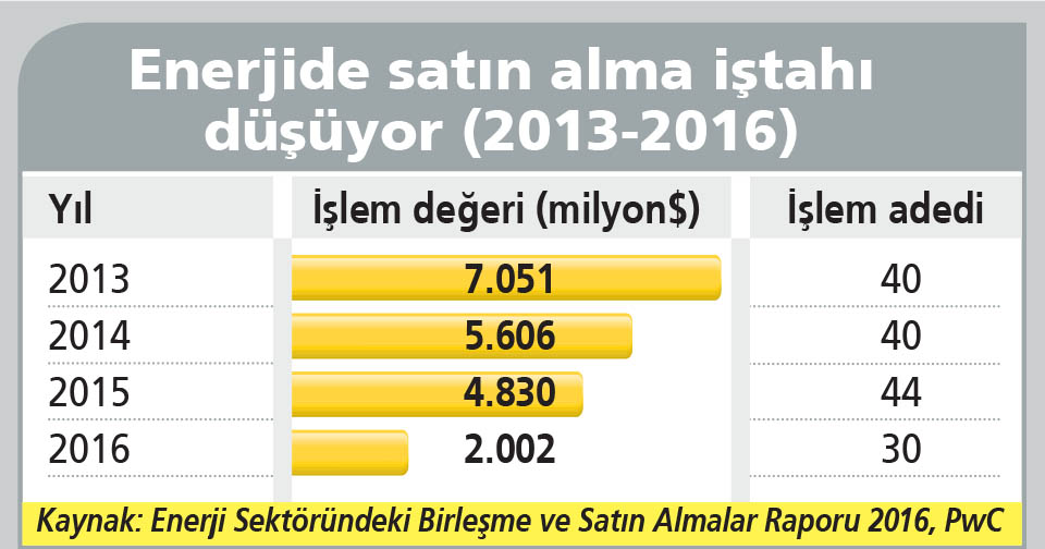 Finansal sıkıntı içinde olan oyuncularda satış eğilimi varken, aynı iştahı alıcı piyasasında görmek pek mümkün değil. Zaten işlem sayısındaki azalma da bunu doğruluyor. PwC 2016 enerji satın alma ve birleşmeler raporuna göre, 2013’ten bu yana toplam işlem değeri ve sayısındaki düşüş 2016’da da devam etti. 2013’te toplam değer 7 milyar dolarken 2014’te 5,6 milyara, 2015’te ise 4,8 milyar dolara geriledi. 2016’da işlem sayısı önceki yıla göre yüzde 32 geriledi. Yaratılan toplam değer de yüzde 59 düşüşle 2 milyar dolarda kaldı. 2017’nin ilk yarısı ise biraz daha hareketli geçiyor. EY’nin satın alma ve birleşmeler raporuna göre bu yılın ilk 6 ayındaki en büyük 10 işlemden 3’ü enerji sektöründeydi. Hatta Hollandalı Vitol’un 1,4 milyar dolar bedelle OMV Petrol Ofisi’ni alması, en yüksek değerli işlem oldu. Uzmanlara göre bir dünya devinin bu alımı yapması, pazardaki güveni tazelemesi açısından kritik önem taşıyor. İşin ticaret ve dağıtım tarafında ise başka dinamikler etkili. Dağıtım sektöründe devlet tarafından garantili kâr marjı, bu alandaki şirketlerin düzgün nakit akışına sahip olması, bu varlıkları yeni ortaklıklara açık hale getiriyor. Uzmanlara göre önümüzdeki yıllarda, özellikle dağıtım tarafında milyar dolarlık birleşmeler gündeme gelecek. Hareketliliğin süreceği diğer alan ise yenilenebilir enerji olacak.