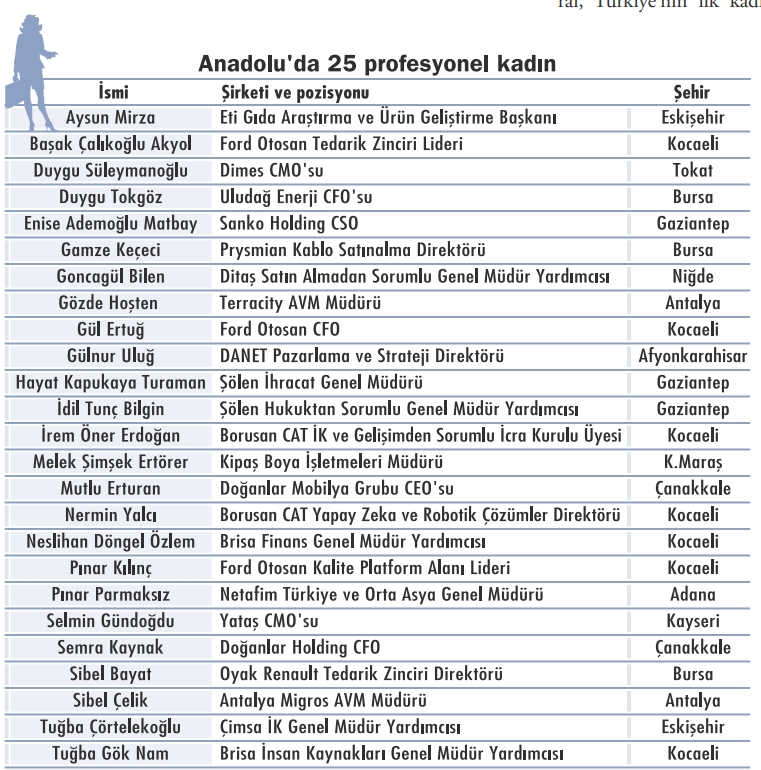 Kadınların iş dünyasındaki yükselişi artık yalnızca büyük şehirlerle sınırlı değil. Anadolu’dan da sayıları az ama etkisi güçlü kadın hikayeleri geliyor. Kadın istihdamını artıran “Anadolu kaplanları”, kadın liderlerin vizyonuyla önemli bir dönüşüm yaşıyor. Bursa’dan Kütahya’ya, Gaziantep’ten Eskişehir’e kadar pek çok şehirde kadın liderler şirket kültürünü yeniden şekillendiriyor, bakış açılarıyla fark yaratıyorlar.