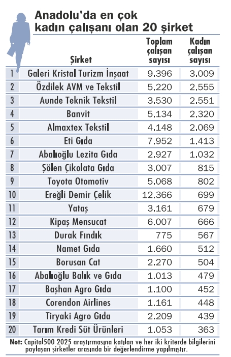 Araştırmadan çıkan verilere göre Anadolu’nun birçok şirketinde kadın çalışan oranı dikkat çekici düzeylere ulaşmış durumda. Örneğin Aunde Teknik Tekstil’de kadın oranı yüzde 72’yi aşarken Özdilek AVM ve Tekstil’de bu oran yüzde 50’ye yaklaştı. Banvit, Galeri Kristal ve birçok perakende şirketi kadın istihdamında güçlü rakamlarla öne çıkıyor.