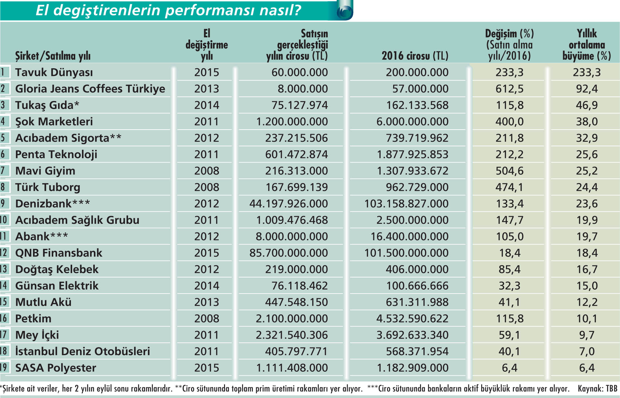Gloria Jeans Coffee 2013’te Grup DNC tarafından satın alındı. Şirket el değiştirdikten sonra müthiş bir performans sergiledi ve her yıl ortalama yüzde 92,4 büyüdü. Gloria Jeans Coffee Türkiye Yönetim Kurulu Başkanı Mehmet Dinçerler, 2012’den bugüne 5 yılda 63 yeni mağaza açtıklarını söylüyor. Günsan Elektrik, el değiştiren başarılı bir diğer şirket. Schneider Electric, 2014 yılında Günsan Elektrik’i satın aldı. Satın almadan sonra yıllık ortalama yüzde 15 büyüme hızına ulaşan Günsan’ın CFO’su Cemal Tosun, bu süreçte yaşadıklarını şöyle anlatıyor: “Geçmişten gelen iş yapış seklimizi geliştirdik. Yeni segmentler piyasaya sürerek, yeni ticaret modelleri geliştirerek şirketin gelişimini hızlandırdık. Hem Türkiye hem ihracat yaptığımız ülkelerde pazar paylarımızı artırdık.” Tavuk Dünyası, 2015’te Mediterra tarafından alındı. Tavuk Dünyası CEO’su Volkan Mumcu, 2015 sonunda 89 olan şube sayısını 2016 sonunda 106’ya çıkardıklarını ve cirolarını yüzde 51 artırdıklarını söylüyor. Mumcu, “Mediterra Capital’in uluslararası deneyimi ve geniş yerel network’ü ise önümüzdeki dönemde büyümemize hız kazandıracak” diyor.