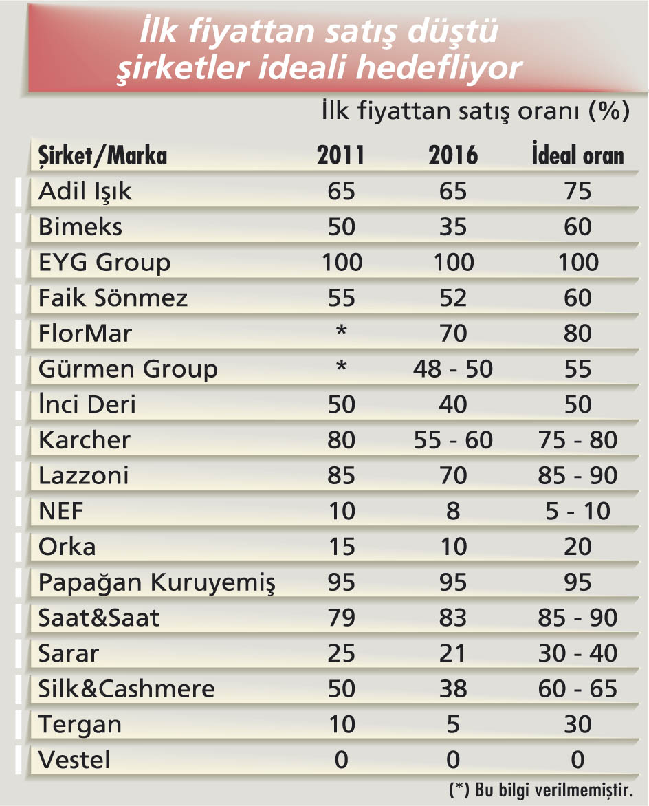 Kozmetik rekabetin yoğun olarak yaşandığı, özellikle birkaç anahtar oyuncunun pazara yön verdiği bir yapıya sahip. Yeni dönemde kişisel bakım marketleri gibi ulusal ve yerel zincirler de tüketicileri indirimle etkileme yönünde adım atıyor. Yine de sektörde ilk fiyattan satış oranı oldukça yüksek. Örneğin Flormar, satışlarının yüzde 70’ini ilk fiyattan gerçekleştirebiliyor. Flormar Pazarlama Direktörü Can Dilek, ürün fiyatlarının kolaylıkla erişilebilir olmasının bunda etkili olduğunu ifade ediyor. İlk fiyattan satış oranının 5 yıl önce çok daha düşük olduğunu vurgulayan Dilek, bu oranın nasıl artırdıklarını şöyle anlatıyor: “Son 3 yıldır bu anlamda daha agresif bir politika izlemeye karar verdik. Sektörümüzde ortalama ilk fiyattan satış oranı yüzde 70-80 arasında değişiyor. Biz de indirimsiz satış oranımızı yüzde 80’e yükseltme hedefindeyiz.” Aksesuar ve saat de perakendenin önemli alanları arasında yer alıyor. Bu alandaki şirketlerin satışlarında da özel günlerde uygulanan kampanyalar oldukça etkili. Saat&Saat Yönetim Kurulu Başkanı Ramazan Kaya, son 5 yılda ilk fiyattan satış oranlarının arttığını ve yüzde 79 olan oranın yüzde 83’e yükselmiş durumda olduğunu belirtiyor. Kaya, sektörde bu oranın yüzde 70 civarında olduğunu açıklarken yine de bu oranların idealin gerisinde kaldığını vurguluyor ve “İdeali yüzde 85-90 civarında sezon ürünü satışı olmalı” diye konuşuyor. Papağan Kuruyemiş Yönetim Kurulu Başkanı Kani Emekçi ise ürünlerinin yüzde 95’inin liste fiyatından satıldığını belirtiyor. Emekçi, bu oranın başka sektör oyuncularında farklılaşabildiğini ama genel olarak sektörde ilk fiyattan satışın yüksek olduğunu ifade ediyor.