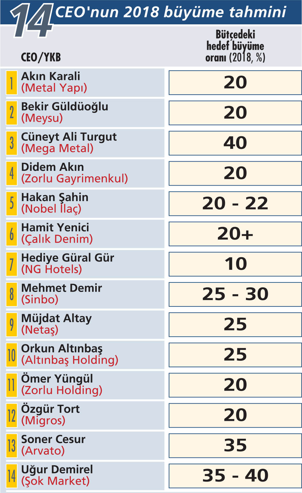 CEO’lar 2018’in baz bütçelerinde kendi kurumları için ortalamada yüzde 20 büyüme öngörüyor. Hatta pek çok şirkette tahminler yüzde 20’in üzerinde. Kasım sonunda bütçelerini bitireceklerini söyleyen Sinbo Yönetim Kurulu Başkanı Mehmet Demir, “Beklentimiz, 2018’de ihracatla birlikte yüzde 25-30 oranında büyümek. İç pazarda böyle bir büyüme beklemiyorum. Bunu ihracatla sağlayacağız” diyor. Türkiye’nin en büyük bakır tel ihracatçısı Mega Metal’in yönetim kurulu başkanı Cüneyt Ali Turgut, “İyi senaryoya göre hazırladığımız baz bütçe senaryomuzda, 2018’de yüzde 40 büyüme öngörüyoruz. İhracat ağırlıklı olduğumuz ve yatırımlarımızı bu yönde yaptığımız için 2018’den umutluyuz” diyor. 2018’de 1 milyar TL sınırını geçeceklerini de sözlerine ekliyor. Migros Genel Müdürü Özgür Tort, 2018 bütçesini kasım sonu gibi bitireceklerini belirterek iyimser ve kötümser olmak üzere 2 senaryolu bütçe hazırladıklarını, iyimser baz bütçe senaryolarında 2018 büyüme tahmininin yüzde 20 olduğunu belirtiyor. “Kipa birleşmesiyle büyüme rakamlarımız geçen yılların üzerinde olacak. 2018’de bu yıldan daha fazla mağaza açacağız” diyen Tort, gelecek yıl mevcut mağazalarına 150-200 arasında yeni mağaza ekleyeceklerini ifade ediyor.