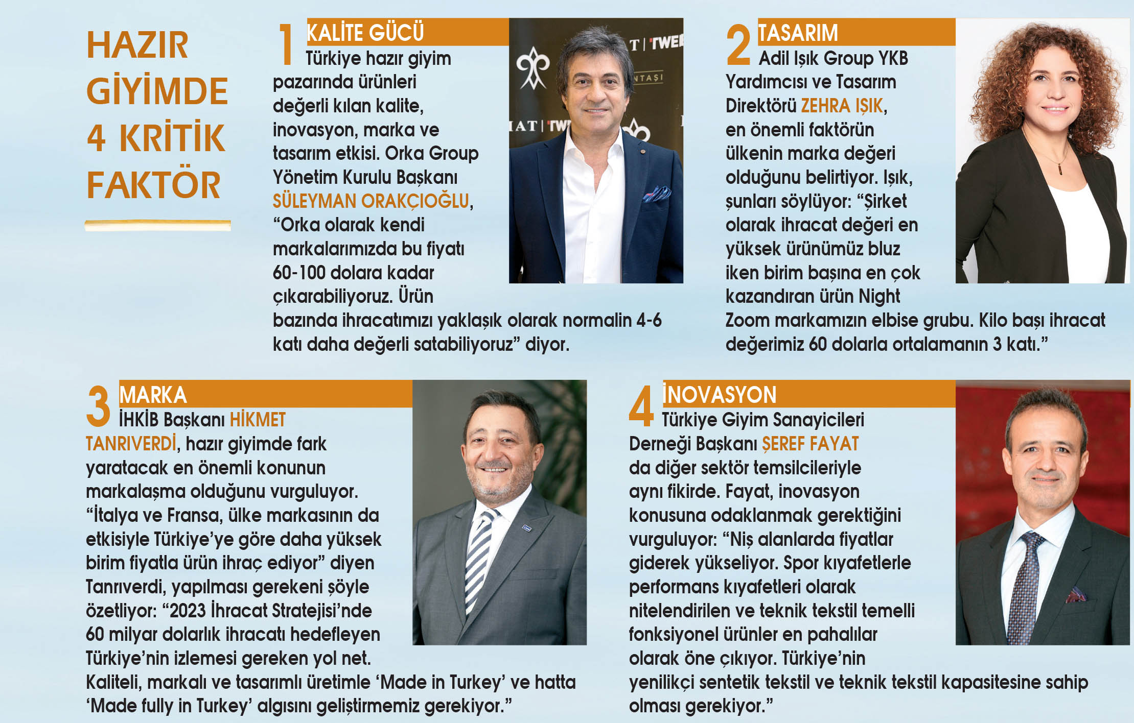 Hazır giyim, Türkiye’nin en yüksek ihracat geliri elde ettiği, lokomotif sektörlerden. Sektörde kilogram başına ortalama ihracat 15-20 dolar arasında değişiyor. İhracat değeri en yüksek kategori ise ortalama 24 dolarla dokuma grubu. Bu da elbise-takım grubunu içeriyor. Bu grupta İtalya 60 dolarlık fiyata sahip. Mobilya sektöründe salon ve yatak odaları kategorisi, ihracat değeri en yüksek ürün grubu olurken fındıkta iç fındık, makine sektöründe büro makineleri öne çıkıyor. Demir ve demir dışı metaller alanında ise mutfak ürünleri, en fazla katma değere sahip kategori. İstanbul Demir ve Demir Dışı Metaller İhracatçıları Birliği Başkanı Rıdvan Mertöz, “Sektörün genel ortalaması kilo başı 3,70 dolarken bu rakam mutfak kategorisinde kilo başı 4,5 dolar” diyor.
