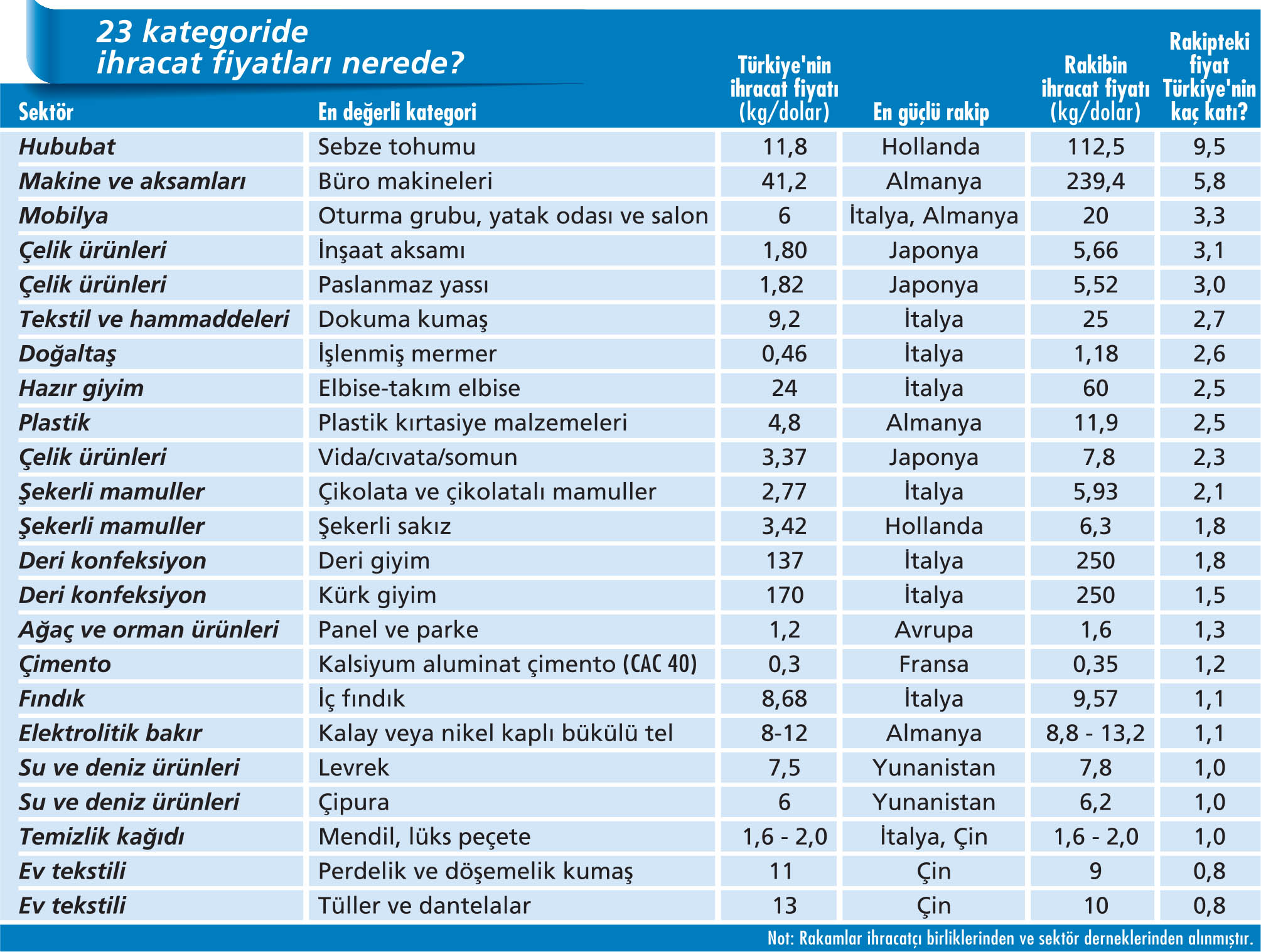 Kilo başı ihracat değeri açısından bakıldığında hububat, makine aksamları, çelik, mermer, tekstil gibi sektörlerde, en yüksek fiyatlı kategorilerde Türkiye, küresel rakiplerin oldukça gerisinde. Fiyat yarışında öne çıkan ülkeler ise Almanya, Japonya, Hollanda ve İtalya. Bu alandaki en çarpıcı örnek hububat sektöründe gözleniyor. Hububatta, hem Türkiye’de hem dünyada kilo başı ihracat değeri en yüksek kategori sebze tohumları. Fiyat, özellikle hibrid tohumlarda ciddi biçimde yükseliyor. Pazarın lideri ise Hollanda. Türkiye’nin sebze tohumu ihracatında kilo başı fiyatı 11,8 dolarken, Hollanda da tam 9,5 katına çıkarak 112,5 dolara ulaşıyor. İstanbul Hububat Bakliyat Yağlı Tohumlar ve Mamulleri İhracatçıları Birliği Başkanı Zekeriya Mete, “Sebze tohumlarında Hollanda lider konumda. Onu Japonya ile ABD izliyor” diyor. Makine ve aksamları sektöründe ihracat değeri en yüksek kategori büro makineleri. Bu kategoride Türkiye’nin kilo başı ihracatı 41,2 dolarken, Almanya’nın fiyatı Türkiye’nin tam 5,8 katı. Makine İhracatçıları Birliği Başkanı Adnan Dalgakıran, “Türkiye bütün ürün gruplarında üretim gücüne sahip. Ancak birim fiyatlarımız maalesef Almanya’ya kıyasla daha düşük” diyor. Çelik ve mobilyada da dünya pazarına hakim olan ülkelerdeki fiyatlar, Türkiye’yi en az üçe katlıyor. Örneğin, mobilyanın en değerli kategorisi olan oturma grupları, yatak odaları ve salon takımlarında Türkiye’nin kilo başı fiyatı 6 dolar civarında. Dünyadaki en yüksek fiyatlı rakipler olan İtalya ve Almanya’da ise fiyatlar 20 doları aşıyor. MOSFED Başkanı Ahmet Güleç, “İtalya tasarım, Almanya ise mühendislik anlamında yaptıkları yatırımlarla mevcut durumlarına ulaşmış durumda” diyor.