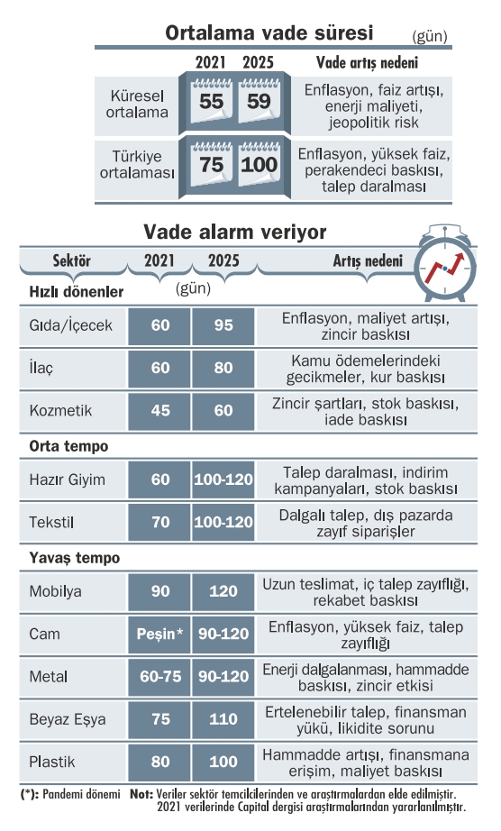 Peki vadede süre ne kadar uzadı? Hızlı tüketim ürünlerinde vadeler 2021’de ortalama 45–60 gün aralığındayken 2025’te 60–95 güne çıktı. Yavaş tempolu ya da dayanıklı ürünlerde ise 75–90 gün seviyesinden 110–120 gün bandına uzama dikkat çekiyor. Mobilyada 120 güne, beyaz eşyada 110 güne, cam ve metalde 90–120 gün aralığına, plastikteyse 100 güne ulaşan vade süreleri var. Bu tablo yalnızca nakit çevrimini yavaşlatmakla kalmıyor; yatırım kararlarının ertelenmesine neden oluyor, kapasite kullanımını sınırlıyor.