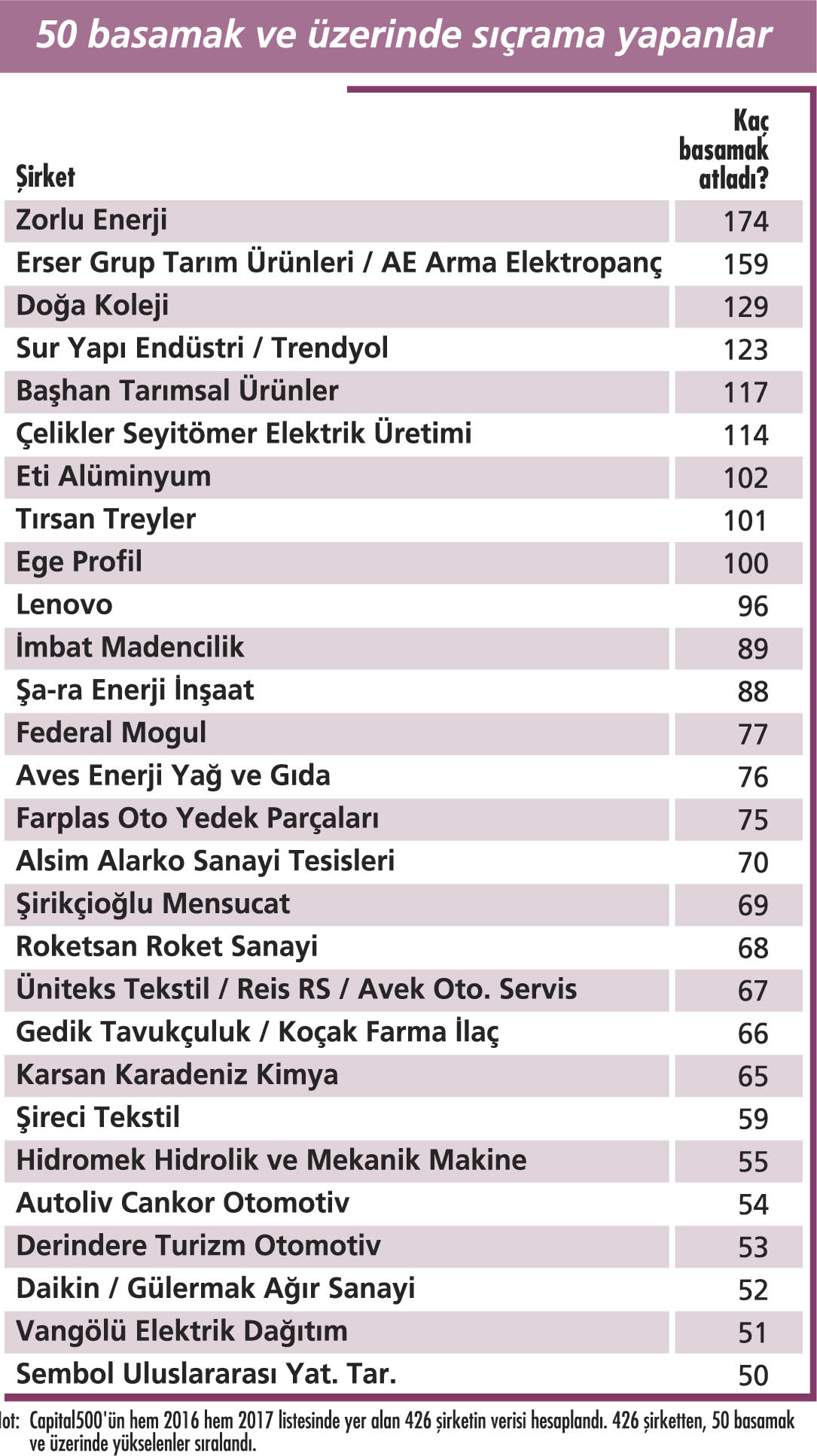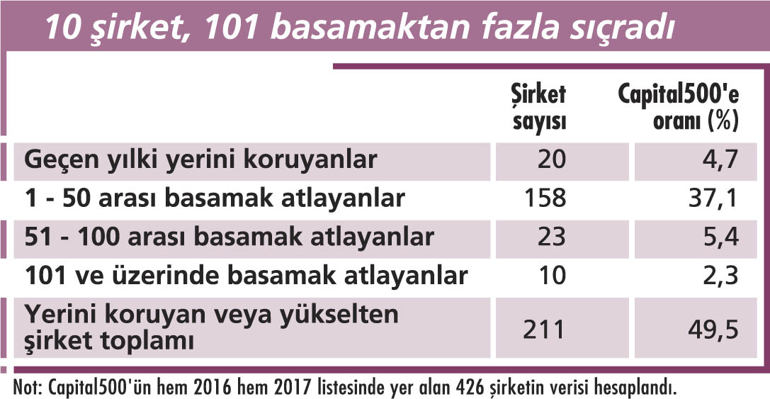 CAPITAL 500, Türkiye’nin en büyük 500 şirketinin sadece finansal sonuçlarını sıralamakla kalmıyor, dev kuruluşların performanslarına, farklı açılardan bakılmasına olanak sağlayan çok değerli bilgiler de içeriyor. 2016 ve 2017 listeleri baz alınarak hesaplanan “Sıçrama Şampiyonları” listesi, bunlardan sadece biri. Capital500’ün hem 2016 hem 2017 listesinde yer alan 426 şirketin verisiyle oluşturulan listenin sonuçları çarpıcı. Örneğin 426 şirketten ancak 211’i, yani yüzde 49,5’i, sıralamadaki yerini bir önceki yıla göre korumayı veya yükseltmeyi başarabilmiş. Bu veri, aslında Capital 500 şirketlerinin nasıl da zorlu bir yılı geride bıraktıklarını net biçimde gösteriyor. Üstelik geçen yılki yerini tam da aynı basamakta koruyan 20 şirketten 10’u, Capital500’ün ilk 10 devi… Sıçrama verilerine göre 426 şirketin 34’ü, geçen yıla kıyasla 50 basamak daha yukarıda kendine yer bulmuş durumda. Bir başka ifadeyle şirketlerin yüzde 8’i… 34 şirketlik listenin zirvesinde ise Zorlu Enerji yer alıyor. Cirosunu geçen yıla göre yüzde 108 artıran ve 1,2 milyar TL’ye ulaşan şirket, bu performansla sıralamadaki yerini tam 174 basamak yukarı taşıyarak “sıçrama şampiyonu” oldu. Sıralamadaki yerini ciddi biçimde yükselten diğer şirketler, ikinciliği paylaşan Erser Grup Tarım Ürünleri ve AE Arma Elektropanç. Her ikisi de bir önceki yıla göre 159 basamak atlamayı başarmış durumda. Onları, geçen yıla göre 129 sıra yükselen Doğa Okulları izliyor.