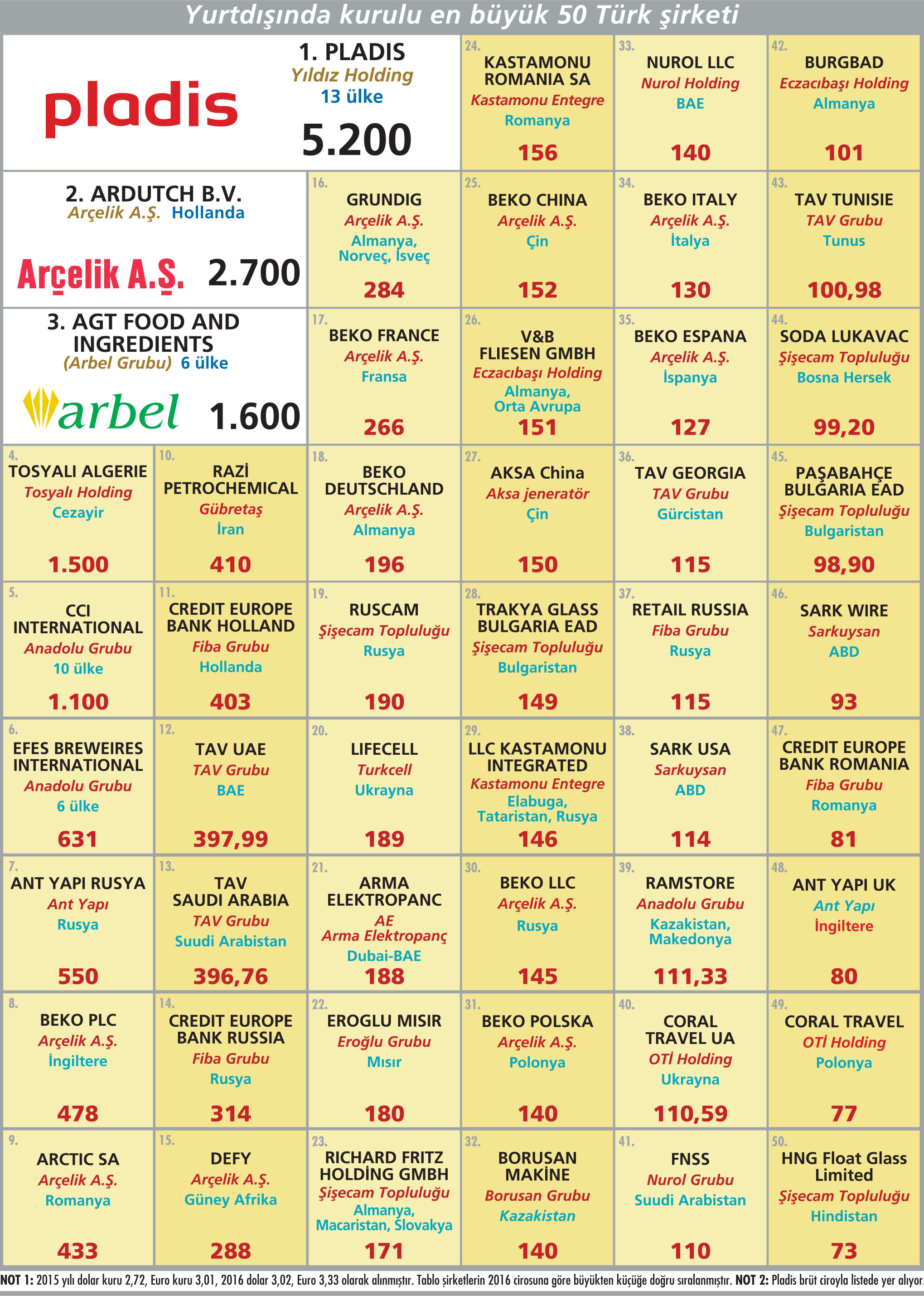 2016, Fed'in faiz artışlarının etkisiyle gelişmekte olan ekonomilerin büyüme hızlarındaki düşüşün devam ettiği bir yıl oldu. ABD başkanlık seçimleri ve Brexit sonrası AB’nin dağılma riskinin ortaya çıkması, global anlamda 2016 yılına damga vuran gelişmelerdi. Türkiye de bu yaşananlardan önemli ölçüde etkilendi ve 2015’e göre büyüme hızı düşüş gösterdi. Yaşanan terör olayları ve darbe girişimi de ülkedeki ekonomik ortamı sarstı. Öte yandan 2015 sonunda uçak krizi ile bozulan Türkiye-Rusya ilişkilerinin 2016’nın ikinci yarısında normalleşmesi, Türkiye’nin hem ticaret hem turizm gelirleri açısından sevindiriciydi. İşte bu ortamda Türkiye’nin global şirketleri her şeye rağmen özellikle Orta Doğu, Kuzey Afrika ve Uzakdoğu pazarlarında önemli büyümelere ve satın almalara imza attı. Örneğin Arçelik A.Ş., Pakistan beyaz eşya pazarının lider oyuncusu Dawlance’ı satın aldı. Pakistan, 200 milyon kişiyle dünyanın 6’ncı büyük nüfusuna sahip. Ayrıca şirket, Hindistan’da Voltas ile ortak kuracağı fabrikayı da 2018’de üretime geçirmeyi planlıyor.