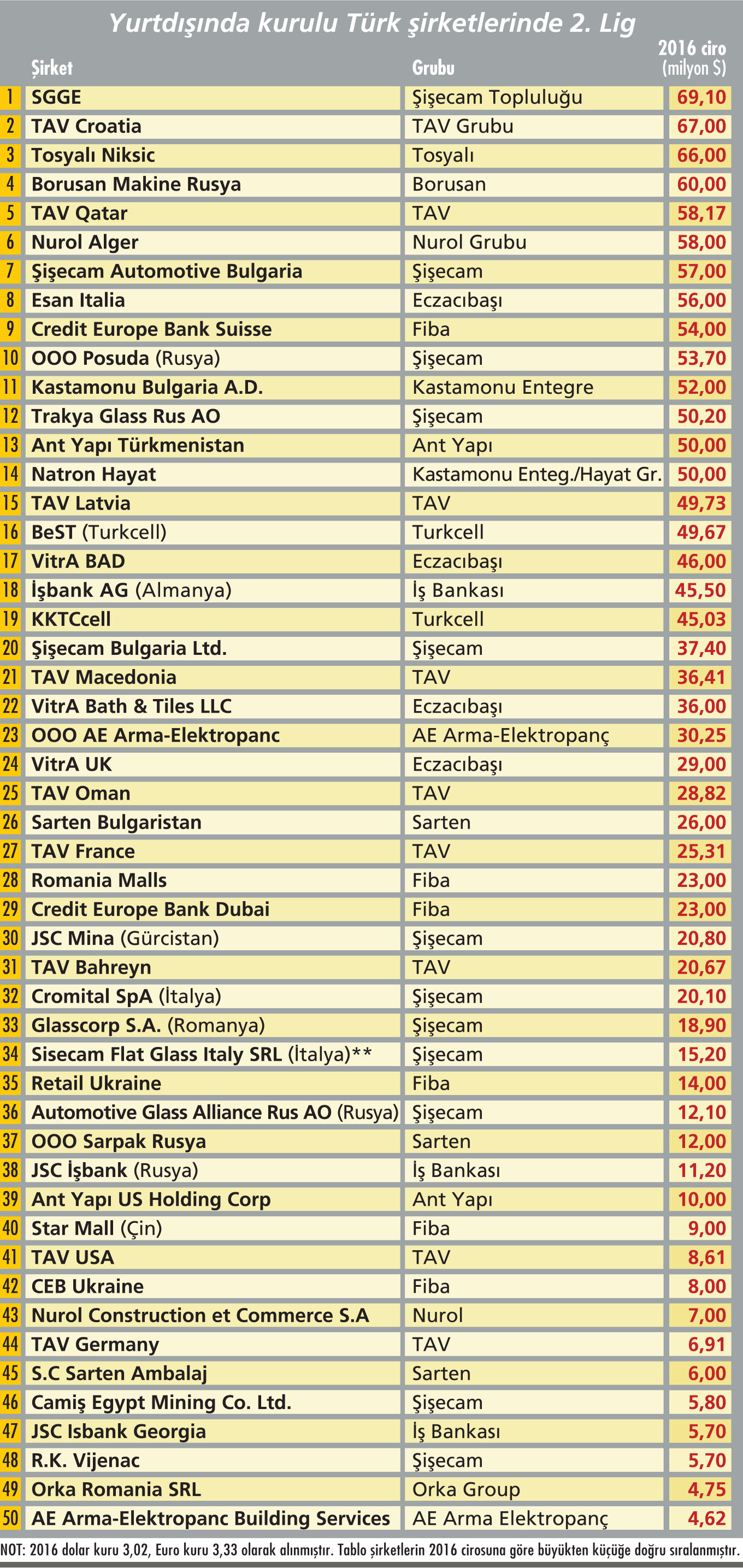 Capital, bu yıl “Yurt Dışında Kurulu En Büyük Türk Şirketleri” araştırmasının 10’uncusunu hazırladı. Yıllardır bu listede bulunan Arçelik, Yıldız Holding, Anadolu Grubu, TAV, Fiba Grubu, Şişecam, Eczacıbaşı gibi global Türk şirketleri, yurt dışındaki hamleleriyle yine dikkat çekiyor. Onların operasyonları arkadan gelenlerin önünü açıyor. 2016’da pek çok Türk şirketi için Doğu Avrupa’da, Orta Doğu’da, Uzak Doğu’da ve Kuzey Afrika’da önemli büyüme rakamları gözlendi. Türkiye’nin Yurt Dışında Kurulu En Büyük 50 şirketinin 23’ü ciroda büyüme elde etti. 18 tanesi ise ciroda kayıplar yaşadı. Kazanımların ve kayıpların yaşandığı 2016’nın ardından global Türk şirketleri, 2017 ve sonrasında hızlı büyümeye odaklandı.