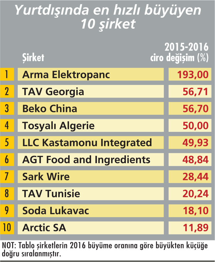 Capital, bu yıl “Yurt Dışında Kurulu En Büyük Türk Şirketleri” araştırmasının 10’uncusunu hazırladı. Yıllardır bu listede bulunan Arçelik, Yıldız Holding, Anadolu Grubu, TAV, Fiba Grubu, Şişecam, Eczacıbaşı gibi global Türk şirketleri, yurt dışındaki hamleleriyle yine dikkat çekiyor. Onların operasyonları arkadan gelenlerin önünü açıyor. 2016’da pek çok Türk şirketi için Doğu Avrupa’da, Orta Doğu’da, Uzak Doğu’da ve Kuzey Afrika’da önemli büyüme rakamları gözlendi. Türkiye’nin Yurt Dışında Kurulu En Büyük 50 şirketinin 23’ü ciroda büyüme elde etti. 18 tanesi ise ciroda kayıplar yaşadı. Kazanımların ve kayıpların yaşandığı 2016’nın ardından global Türk şirketleri, 2017 ve sonrasında hızlı büyümeye odaklandı.