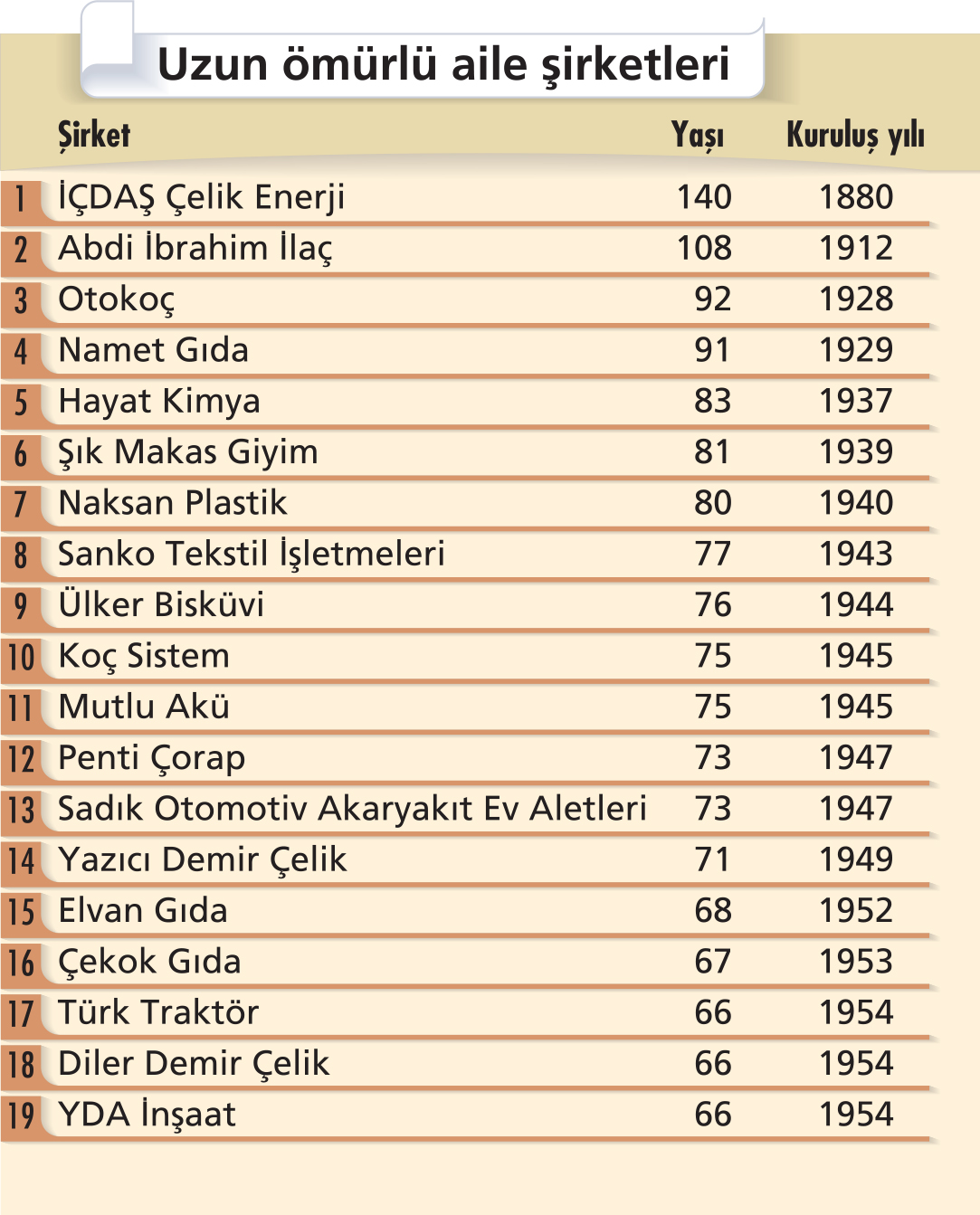 Türkiye’deki şirketlerin yüzde 95’ini ve halka açık şirketlerin yüzde 75’ini aile şirketleri oluşturuyor. Ancak Türkiye’de aile şirketlerinin ömürleri 25-30 yılla sınırlı. Bu aile şirketlerinin sadece yüzde 30’u ikinci, yüzde 12’si üçüncü nesle geçebiliyor. Dördüncü nesle geçebilenlerin oranı ise yüzde 3’te kalıyor. Bazı uzmanlar, oranın bundan daha düşük de olabileceğini söylüyor. Kuşaktan kuşağa geçişi başarmak, kurumsal yönetişim, aileiş ilişkilerini çağdaş bir düzene oturtmak, aile şirketlerinin önündeki en önemli zorluklar… Türkiye’de aile şirketlerinin ortalama ömrü 25 yıl olsa da başarıyı yakalayan çok sayıda aile şirketi var. 50 yılın üzerinde faaliyet gösteren bu şirketler, Türkiye ekonomisine yön veriyor. Capital500 listesinde yer alan şirketleri incelediğimizde de benzer bir tabloyla karşılaşıyoruz. Listenin yüzde 25,8’i, yani 129’u 50 ve üzeri yaşta şirketlerden oluşuyor. Bu şirketlerin ise yüzde 54,3’ünü yani 72’sini ise aile şirketleri oluşturuyor. Capital500 sıralamasında yer alan ve 60 yaşın üzerinde olan ve TAİDER kriterlerine göre aile şirketi olarak nitelendirilenlerin sayısı ise 38. Bugün 100 yaşını aşan şirketler arasında İçtaş Çelik Enerji ve Abdi İbrahim gibi kurumlar bulunuyor. Otokoç, Namet, Hayat Kimya, Şık Makas, Naksan Plastik, Sanko Tekstil, Ülker Bisküvi, Koç Sistem, Penti Çorap da 70 yılı devirmiş durumda. 60 yaş ve üzerinde pek çok şirketi olan Koç Grubu ise listenin en güçlü ailesi olarak öne çıkıyor.
