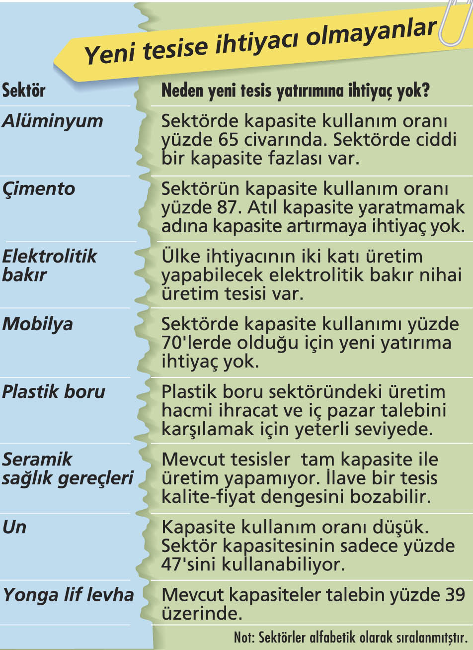 Peki sektörlerde yeni tesis yatırımına ihtiyaç var mı? Seramik sağlık gereçlerinden, alüminyuma, çimentodan plastik boruya birçok sektör temsilcisi bu soruya “hayır” yanıtı veriyor. Hatta yeni kapasitelerin devreye alınmasını önemli bir risk olarak görüyorlar. Bunun nedeni ise mevcut kapasitelerin tam kullanılamıyor oluşu… Sarkuysan Yönetim Kurulu Başkanı Hayrettin Çaycı, şu anda ihtiyacın 2 kat üzerinde üretim yapabilecek tesisler olduğunu dile getiriyor. Ege Vitrifiye Genel Müdürü Merter Savaş “Mevcut şirketler bile tam kapasiteyle üretim gerçekleştirmiyor. İlave bir tesis talepten fazla arz yaratarak, ortalama kalite-fiyat dengesini bozabilir, iç piyasa rekabetini olumsuz etkileyebilir” diye konuşuyor. ÇEİS (Çimento Endüstrisi İşverenleri Sendikası) Başkanı Tufan Ünal da sektörde kapasite kullanım oranının yüzde 87 civarında olduğunu belirtiyor. Atıl kapasite yaratmamak adına kapasite artırmaya ihtiyaç olmadığını söylüyor. GF Hakan Plastik Türkiye ve Ortadoğu Bölge Başkanı Batuhan Besler de kendi sektörleri açısından yeni tesis yatırımına ihtiyaç olmadığı görüşünde. “Plastik boruda üretim hacmi ihracat ve iç pazar talebini karşılamak için yeterli seviyede” diyor. Lila Kâğıt Genel Müdürü Alp Öğücü, temizlik kağıdı üretiminde ihracat ve yurt içi pazardaki büyümeye rağmen 5 yıl yetecek kadar kapasite fazlası olduğunu anlatıyor. “Kapasite kullanım oranı yüzde 72’ler düzeyinde. Bu durum rekabetin yoğun ve üreticiler için kârlılığın da oldukça düşük olmasına neden oluyor” diyor. Davut Doğan, kapasite kullanımı yüzde 70’lerde olan mobilyada yeni tesis yatımına gerek olmadığının altını çiziyor.