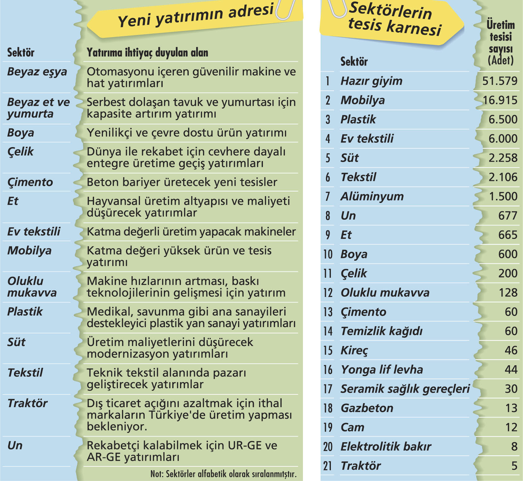 Sanayede yapılacak her yatırım hem Türkiye’nin küresel rekabetteki gücünü hem içeride hassas karnı olan istihdamı iyileştirme noktasında kritik önem taşıyor. Ancak sektör yetkililerine göre son 10 yılda üretimde sıfırdan yeni tesis yatırımı konusunda Türkiye’nin performansı çok parlak değil. Birçok sektör uzmanı son 10 yılda kendi sektörlerinde önemli bir yatırım olmadığını ifade ediyor. Örneğin beyaz eşya sektörünün en büyük tedarikçilerinden Farel’in genel müdürü Haluk Akçalı, beyaz eşyada son yıllarda öne çıkan yatırımları “Whirpool’un Indesit’i satın alması, Vestel ve BSH’nın kapasite büyütmesi ve Arçelik’in Romanya ve Hindistan başta olmak üzere küreselleşme atakları” olarak sıralıyor. Ege İhracatçı Birlikleri Koordinatör Başkanı Sabri Ünlütürk, tekstil sektöründe büyük bir yatırım olmadığını dile getiriyor. Doğtaş Yönetim Kurulu Başkanı Davut Doğan da mobilyada gözlemledikleri kayda değer bir yatırım olmadığını belirtiyor. Yapılan yatırımlara bakıldığında ise bütçelerin genellikle yenileme ve kapasite artırmaya gittiği gözleniyor. Ünlütürk, son yıllarda tekstil sektöründeki tüm şirketrin 5-10 milyon dolar aralığında kapasite ve yenileme yatırımı yaptıklarını anlatıyor. Davut Doğan da mobilyada hayata geçen bazı yatırımları şöyle anlatıyor: “Kelebek Mobilya Düzce tesislerinde 12 bin metrekarelik kapalı alan ve teknoloji yatırımı yapıldı. İzmirli Konfor Mobilya yeni yatırım hazırlığı içinde. Üretim tesislerini yeni alana taşımak istiyorlar.” Plastik sektöründe ise 2012-2016 yılları arasında 4 yılda 821 milyon dolarlık makine ve teçhizat yatırımı gerçekleştirildi. Seramik sağlık gereçleri alanında Vitra, iki yıl önce üretim kapasitesini yüzde 20 artıracak bir tesis için 45,5 milyon Euro’luk bir yatırım yaptı.