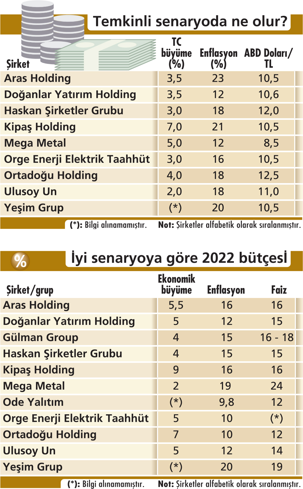 2021-2024 dönemini kapsayan Orta Vadeli Program’a göre Türkiye ekonomisinin 2022’de yüzde 5, 2023 ve 2024’te ise yüzde 5,5 büyümesi öngörülüyor. 2022 bütçelerinde CEO’ların enflasyon tahmini çift haneli olurken iyi senaryoda enflasyonun yüzde 15 olacağı, ekonomininse yüzde 5 büyüyeceği öngörülüyor. İyi senaryoda enflasyonun yüzde 12 olacağını belirten Ulusoy Un Yönetim Kurulu Başkanı Dr. Eren Günhan Ulusoy, ekonominin yüzde 5 büyüyeceğini belirtiyor. Kötü senaryoda ise doların 11 TL’ye çıkmasını, büyümenin yüzde 2, enflasyonunsa yüzde 18 olmasını bekliyor. 2022 için temkinli bütçe hazırladıklarını belirten Kipaş Holding Yönetim Kurulu Üyesi Hikmet Gümüşer de doların iyi senaryoda 10 TL, kötü senaryoda 10,5 TL olacağını söylüyor. Gümüşer, büyümeyi iyi senaryoda yüzde 9, kötü senaryoda yüzde 7 tahmin ediyor. 2022 için yatırım odaklı büyüme bütçesi hazırladıklarını belirten Aras Holding Taşıma Grup Başkanı Recep Demir, temkinli senaryoda dolar kurunun 10,5 TL, büyümenin yüzde 3,5, TÜFE’nin yüzde 21, faiz oranının yüzde 14 olacağını öngörüyor. 2022 iyi senaryoda ekonominin yüzde 5 büyüyeceğini, enflasyonun yüzde 10 olacağını söyleyen Orge Enerji Elektrik Taahhüt CEO’su Nevhan Gündüz, “Kötü senaryoda beklentim yüzde 3 büyüme, yüzde 16 enflasyon” diyor. Gündüz, doların 10,5 TL olmasının olumsuz olacağını ifade ediyor. Ortadoğu Holding İcra Kurulu Üyesi Nusret Kayhan Apaydın ise muhafazakar senaryoda doların 12,5 TL’yi göreceğini, faizin yüzde 20, enflasyonun yüzde 18, büyümenin yüzde 4 olacağını belirtiyor.