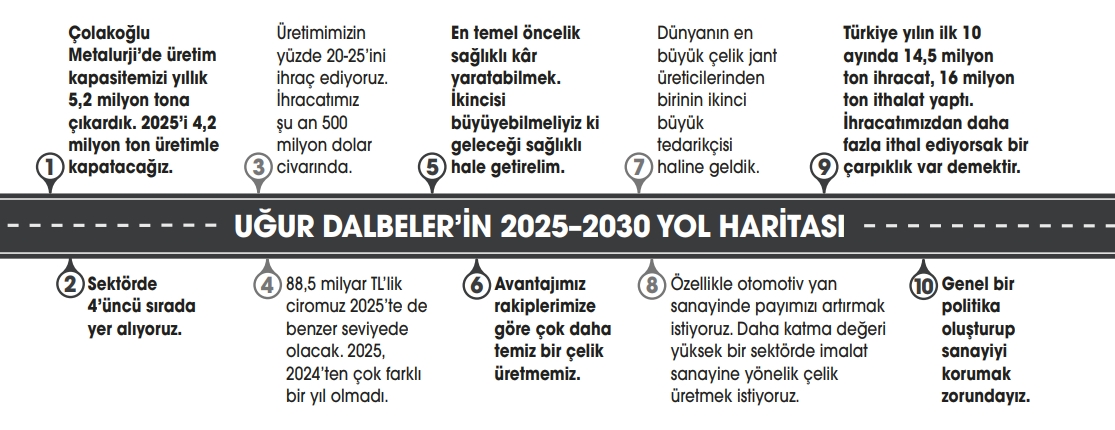 Şirketin genel müdürü Uğur Dalbeler ise 2026 yılında Çolakoğlu Metalurji’deki 40’ıncı yılını doldurmaya hazırlanıyor. Dalbeler, geçtiğimiz aylarda küresel çelik sektörünün çatı kuruluşu olan Dünya Çelik Birliği’nin (World Steel Association) başkanlığına seçilerek Türk çelik sektörü adına önemli bir temsiliyet gücü elde etti. Dalbeler ile hem Çolakoğlu Metalurji’nin bugününü ve yol haritasını hem küresel çelik sektöründe sertleşen rekabeti, artan korumacılığı, Çin’in agresif ihracat politikasını ve Türkiye’nin bu yeni düzende nasıl konumlanması gerektiğini konuştuk.