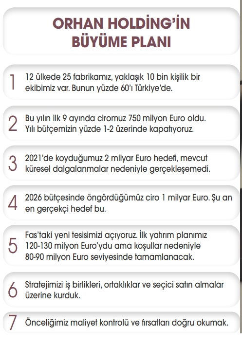 Bundan 5 yıl önce 2025 için 2 milyar Euro ciro hedefi koyan Orhan, bu eşiğin küresel dalgalanmalar nedeniyle geri çekildiğini belirtiyor ve ekliyor: “Bu hedefi mevcut ortamda tutturamayacağımızı görüyoruz, önceliğimiz zararı minimize edip fırsatları doğru okumak.” Bu nedenle grubun yeni büyüme stratejisini organik gelişimden çok ortaklıklar, iş birlikleri ve olası satın almalar üzerine kurduklarını belirten Orhan, şunları söylüyor: “Coğrafi rekabet yükseldikçe biz de Asya’daki üreticilerle nasıl iş birliği yapabileceğimizi değerlendiriyoruz. Bu iş birlikleri ticari, stratejik, teknolojik ya da birleşme-satın alma şeklinde olabilir.