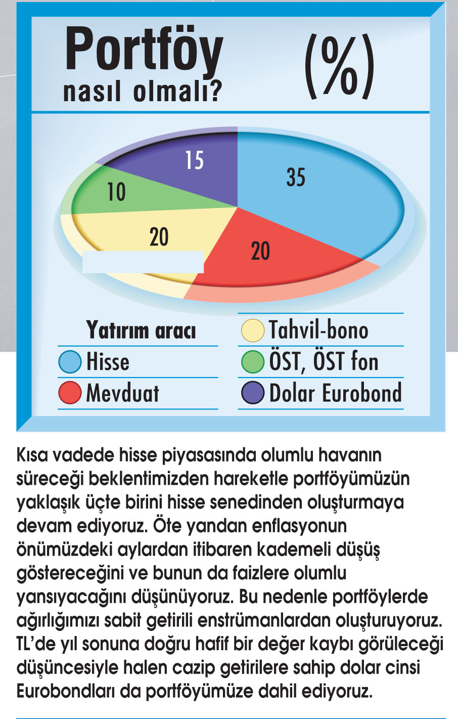 Referandum sonrası hisse piyasasında olumlu beklentimiz mevcut. Piyasanın ve özelde bankaların son dönemdeki güçlü hareketlere rağmen hala ucuz seviyelerde işlem gördüğünü düşünüyoruz. Özellikle piyasada seçim belirsizliğinin ortadan kalkması ve muhtemelen ekonomi politikalarının önümüzdeki dönemde daha öne çıkması söz konusu olacak. Yine orta vadeli yapısal reform ajandasının canlandırılması ve son dönemde Kredi Garanti Fonu desteğiyle yatırım ve işletme sermayesi tarafında reel sektörün elinin rahatlatılması da büyüme dinamikleri ve piyasa üzerinde olumlu olacaktır. Bu 264 şablonda halihazırda 10 hisseden oluşan model portföyümüzde üç banka ve 7 banka-dışı hisse bulunuyor.