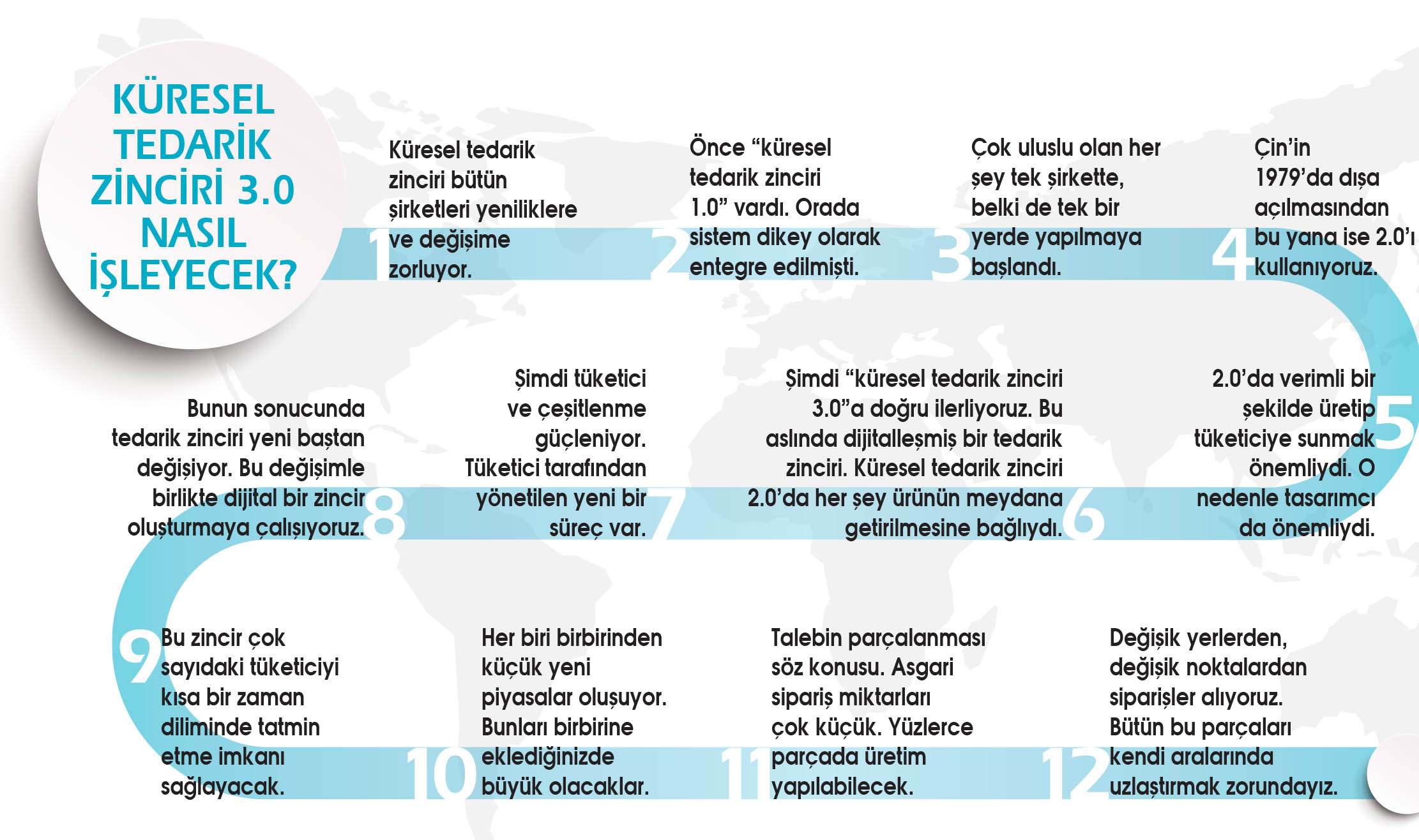 Tedarik zinciri 3.0 uzun bir zaman alacak. Bu anlamda bizim de büyük projelerimiz olacak.Dünya çapında 40 ülkede, 15 bin civarında tedarikçimiz var. 10 milyon işçi üzerinde tedarikçiler vasıtasıyla araştırma yaptık. Her bir çalışan bir sensör, bir çip sahibi olacak. Bu şekilde üretim sürecindeki işçilerin faaliyetleri yakından takip edilebilecek.