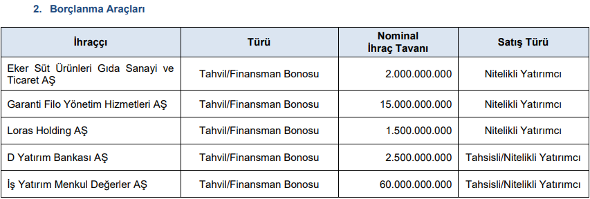 SPK’nın borçlanma aracı ihracını onayladığı şirketler: