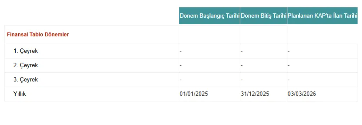Yapılan açıklamada, finansal sonuçların Borsa İstanbul'da işlemlerin tamamlanmasının ardından, seans kapanışı sonrasında yayımlanacağı belirtildi. Söz konusu duyurunun yeni bir bildirim olduğu; herhangi bir güncelleme, düzeltme veya erteleme içermediği bilgisi de paylaşıldı.