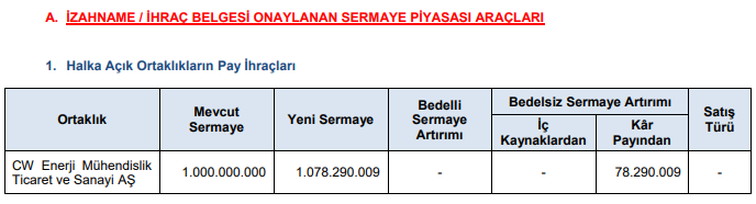 CW Enerji, sermayesini kâr payından bedelsiz olarak % 7,829 oranında artıracak. Artırım sonrası şirketin ödenmiş sermayesi 1 milyar 78 milyon TL’ye ulaşacak.