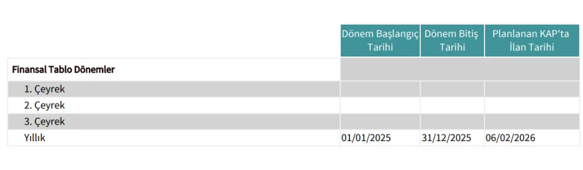 Şirketimizin 01.01.2025 – 31.12.2025 hesap dönemine ilişkin finansal raporlarının 06 Şubat 2026 tarihinde kamuya açıklanması planlanmaktadır.